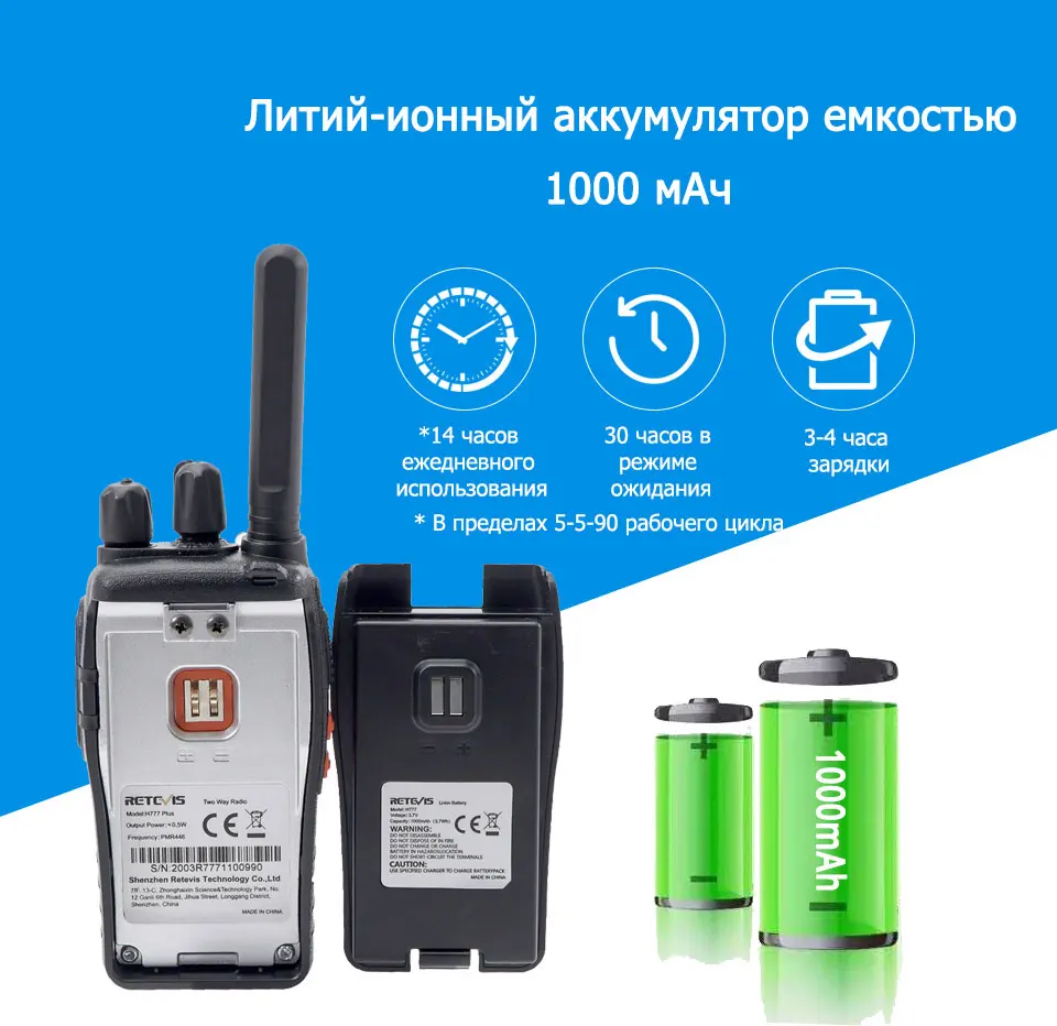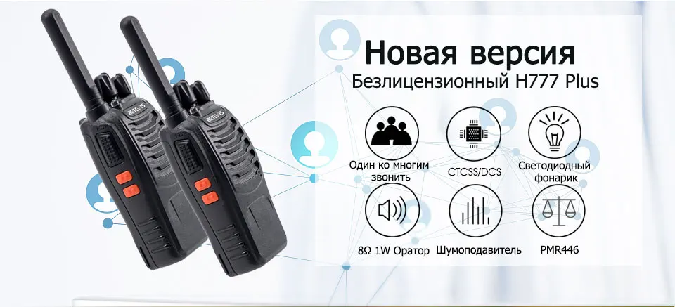Никаких юридических проблем и дополнительных сборов за использование частот. Версия PMR H777 plus не требует лицензирования для Европы, версия FRS H777 предназначена для США и Канады.