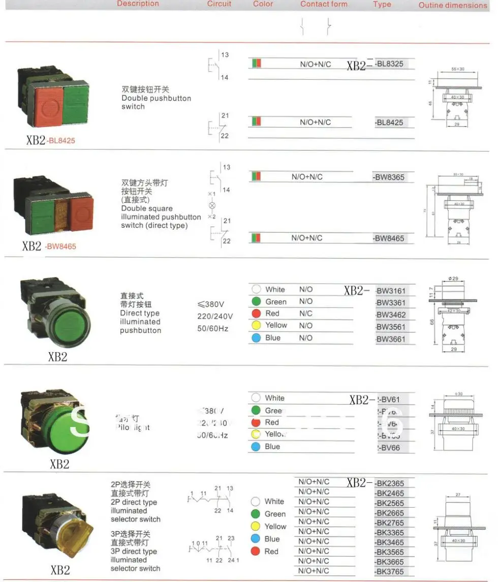 Кнопочные переключатели Серии XB2 используются в промышленных цепях управления переменного тока 50 Гц или 60 Гц, Номинальное рабочее напряжение до 380 В и ниже, рабочее напряжение постоянного тока до 220 В и ниже для управления магнитным стартером, контактором, реле и другими электрическими схемами. Кнопки с индикацией соответствуют стандарту GB14048.5-2001.