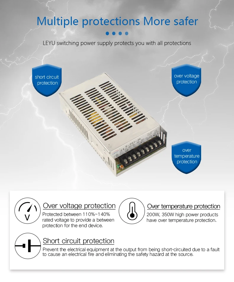 Protection type: shut down o/p voltage, recovers automatically after fault condition is removed