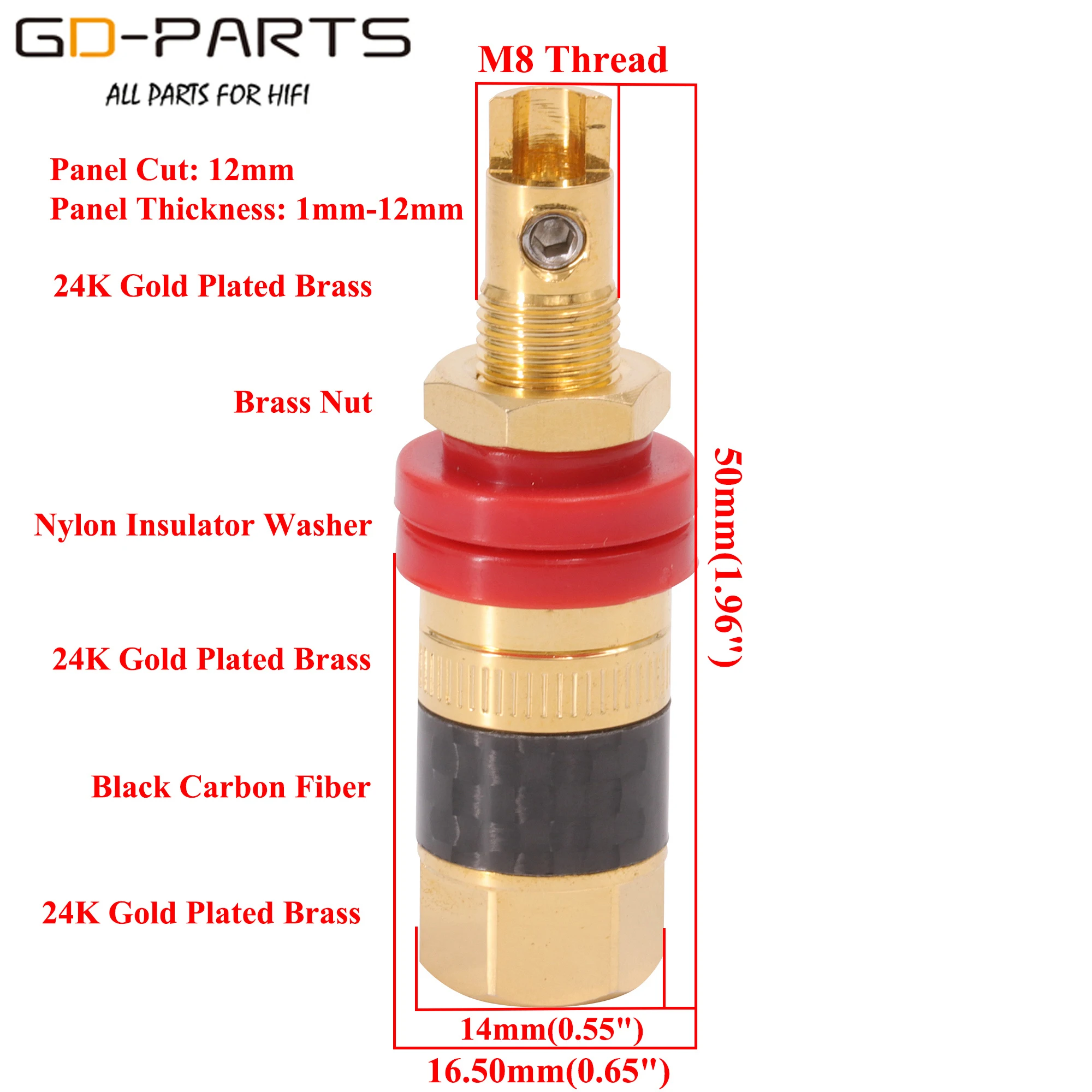 Вырезанная панель: 12 мм Панель Толщина: 0,8 мм-10 мм Резьба M8 Общая длина: 58 мм 1. Латунь, RoHs, позолота 24K 2. Корпус из углеродного волокна 3. Красная и Белая нейлоновая шайба 4. C3064 Латунная гайка 5. Латунь, Rohs, 24K позолоченный