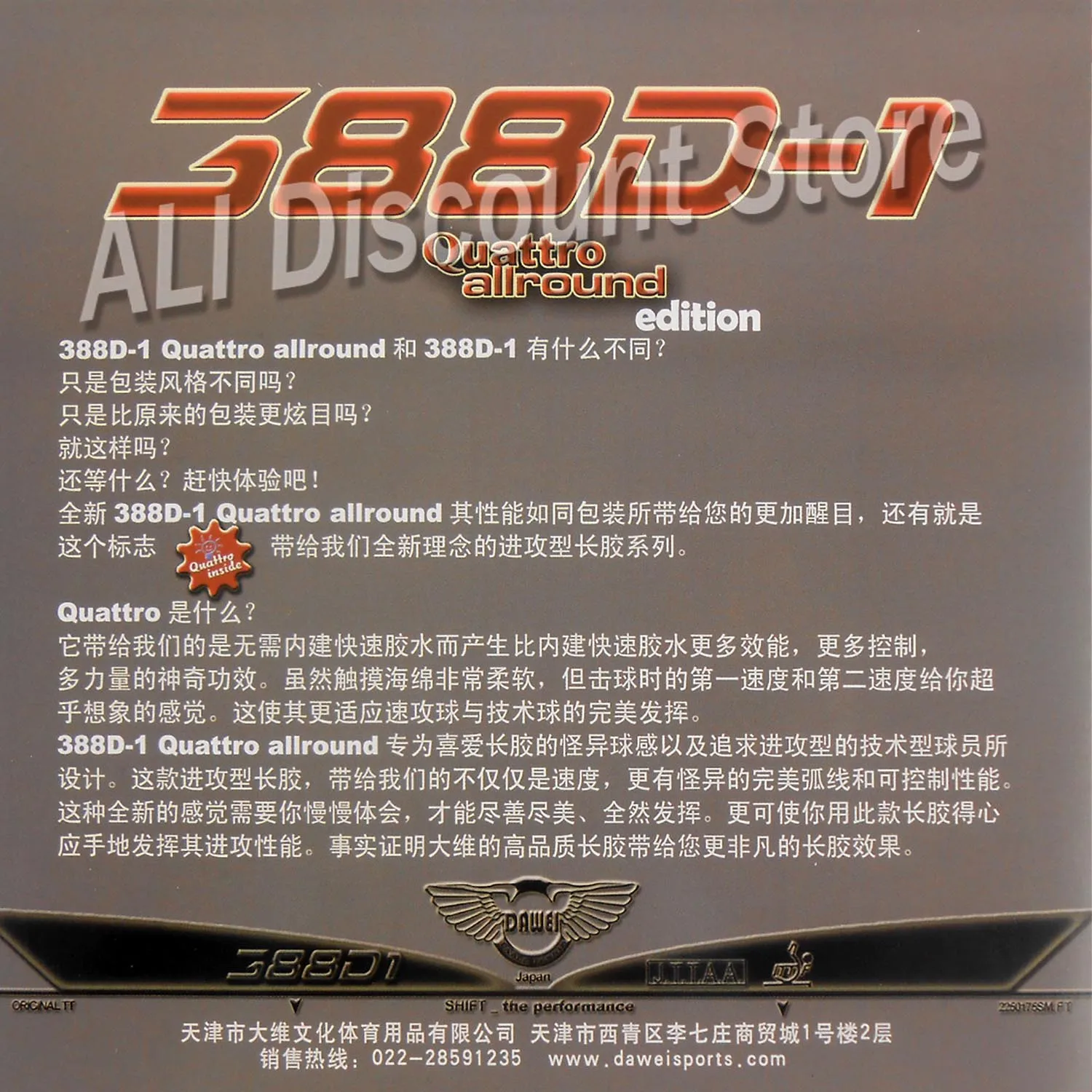 Dawei 388D-1 Quattro Allround Long Pips-Out Резина для настольного тенниса с губкой В чем разница между 388D-1 Quattro allround edition и 388D-1? Только стиль дизайна упаковки? Есть ли не более красочные, чем 388D-1? Только это? Почему вы ждете? Попробуем! Что такое Quattro? Quattro создал максимальный эффект скоростного клея внутри резины, но на 100% без скоростного клея для эффекта мыши, большего контроля, большей мощности. Хотя губка мягче, она дает вам больше эффекта от первой и второй скорости, невообразимо. Подходит для оскорбительного и технического стиля. Новая бесфрикционная длинная резина с шероховатой, но полностью бесфрикционной поверхностью обеспечивает отличный контроль при возврате, блокировке, нападении и защите, А также общие тревожные свойства для блокировки близко к столу, благодаря его верхнему жесткому + телу мягкие прыщи. С другой стороны, 388D-1Quattro позволяет вам атаковать при производстве колеблющихся шаров. Это можно сделать как на нарезанных, так и на плавающих шариках, чтобы сделать вашу игру более обманчивой. Эта Резина создает деструктивный эффект, в частности, при блокировке и прямом ударе, так как мяч ударяется очень плотно и, как правило, остается низким после отскока. Благодаря губке 0,5, 0,8, 1,0 мм, 388D-1 Quattro позволяет вам создавать динамичную атакующую игру, оказывая давление на противника с помощью контратаки, подъема и разбивания. С помощью тонкой губки (0,3 мм) Резина обеспечивает еще более разрушительный эффект при игре близко к столу. Цвет резины: красный или черный Резины используются в посылка вках посылка может отличаться, резины одинаковые Цена указана только за одну резину с губкой.