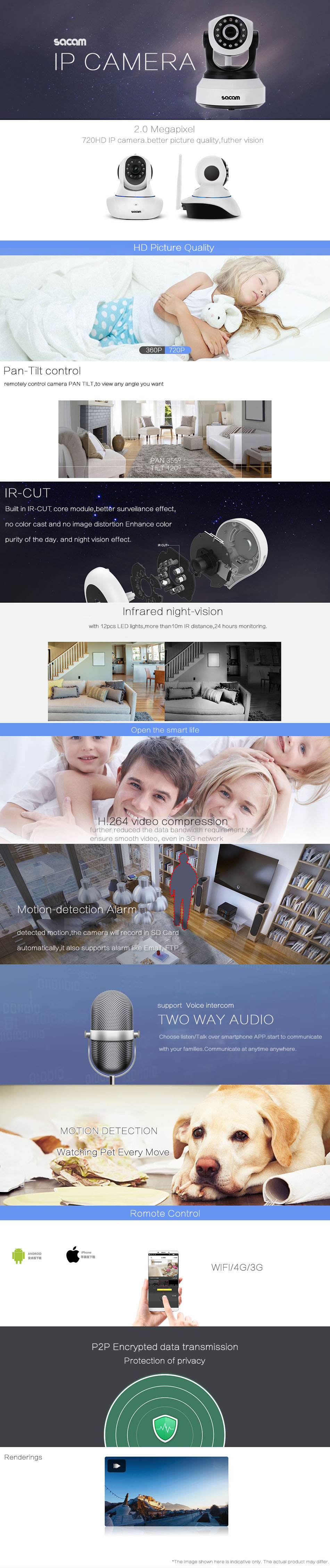 Wi-Fi-N, панорамирование/наклон, дистанционное управление просмотром в Интернете, обнаружение движения, ночное видение