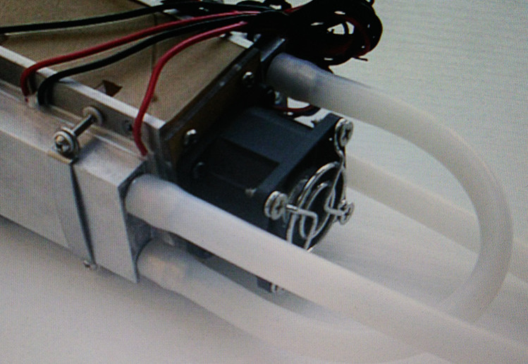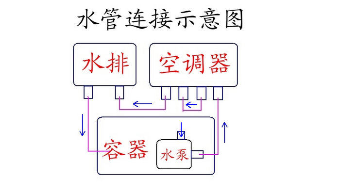 Ниже приведена схема подключения. Поместите небольшой водяной насос непосредственно в контейнер,(Синяя стрелка указывает направление потока воды)Подключите выход для воды с помощью кондиционера