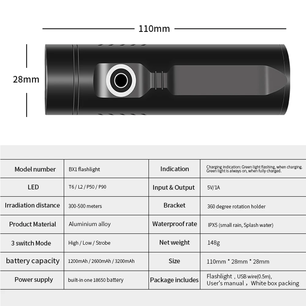 Особенности: 1. Изготовлен из алюминиевого сплава, прочный и водонепроницаемый, он может использоваться в дождливые дни, как правило, удобный дизайн. 2. Небольшой по размеру и весу светильник, легко носить с собой и хранить. На поверхности есть Пряжка для ручки, ее легко зафиксировать на кармане или вырезе. 3. Светильник источник T6/L2/P50/P90 светильник шарик, высокая яркость, и с низким затуханием, длительный срок службы. 4. Черный внешний вид, простой и стильный, шикарный и очаровательный, полный индивидуальности и привлекательный. 5. Это также может быть мини-Банк питания, который может поставлять для телефона, практичный и удобный в использовании. 6. Существует 3 светильник (несколько режимов работы), чтобы отрегулировать, сильный/одежда/флэш-памяти, которые могут удовлетворить запросы клиентов идеально. Спецификация: Размер: Длина: 110 мм Диаметр: 28 мм Цвет корпуса: черный Светильник Цвет: белый Светильник режим: сильный/одежда/флэш-памяти Светильник из бисера: T6/L2/P50/P90 Вес: 197 г Количество: 1 шт. Материал: алюминиевый сплав Диапазон освещения: 300-500 м Рабочее напряжение: 3,7 V Напряжение зарядки: 5 В/1 А Выходное напряжение: 5 В/1 А Цветовая температура: 7500K Питание: встроенный аккумулятор 1200 мАч Время зарядки: 2,5 ч Время выдержки: 3/3/0.5/0.5 ч Посылка включает в себя: 1 * Фонарик 1 * USB кабель 1 * Руководство пользователя