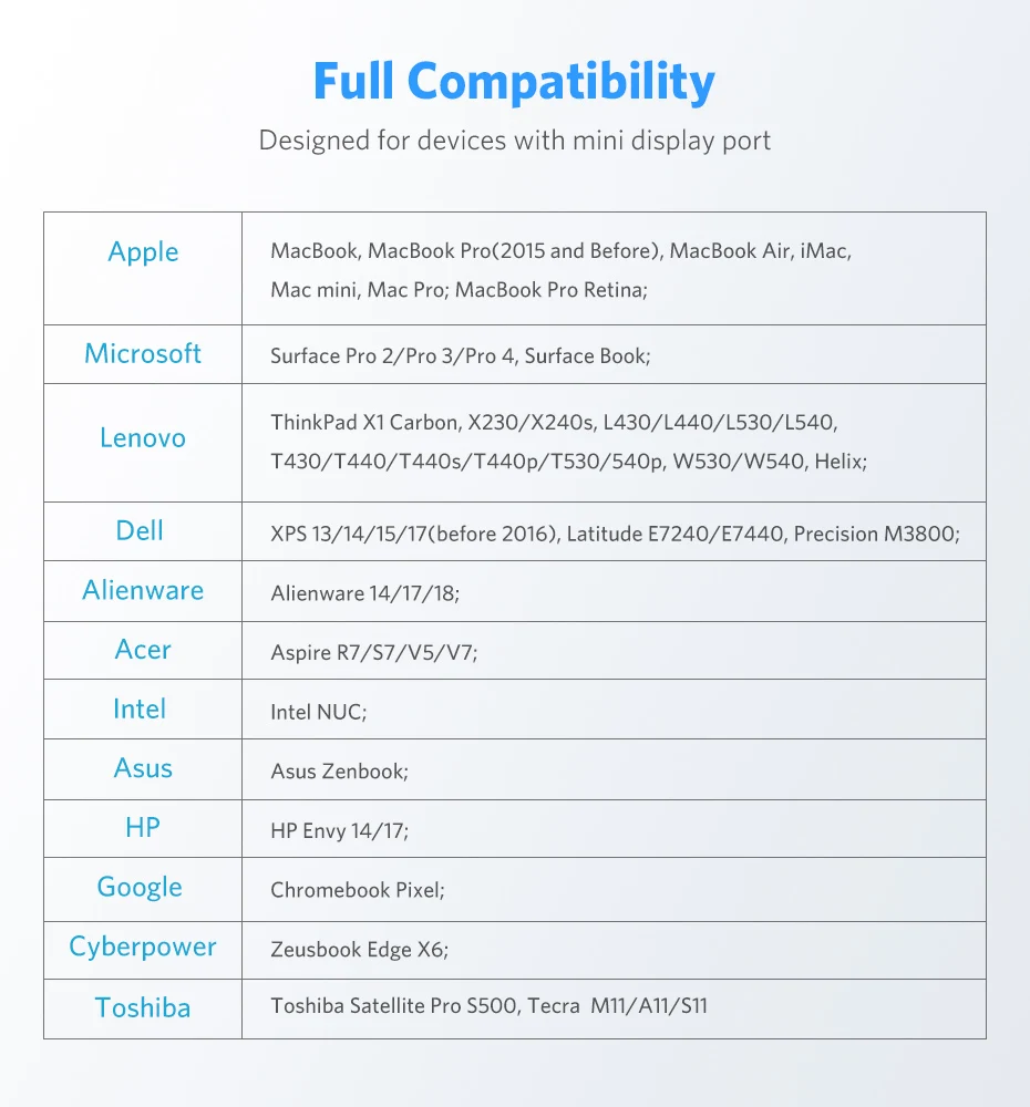 Совместим с ThinkPad X1, DELL XPS14z, XPS15, Macbook AIR, Macbook Mac mini, iMac MB413/MB418/MB420/MB466/MB467/MB470/MB471 и так далее. Устройства NApple, выпущенные до апреля 2010 года, не поддерживают аудиовыход и не передают звук с Mini DisplayPort. Mini DisplayPort, поддерживающий аудио и видео, доступен только для устройств Apple, которые выпущены после апреля 2010 года. Перед покупкой данного продукта убедитесь, что устройство совместимо.