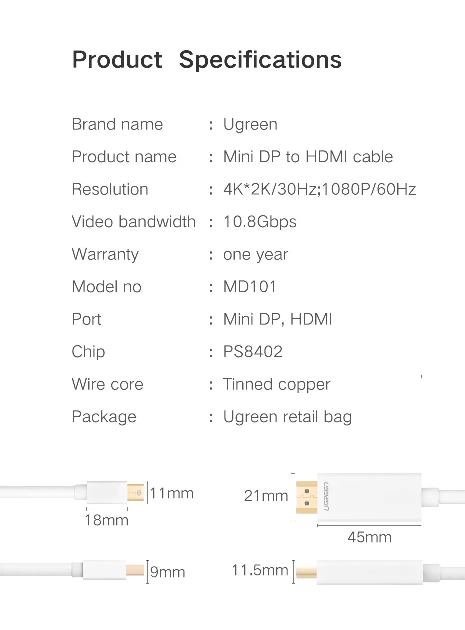 Кабель UGREEN mini DP к HDMI поддерживает разрешение видео до 4K * 2K,1920x1200 и 1080p (Full HD) и безупречный аудио-канал для несжатого цифрового 7,1, 5,1 или 2 канала. Материал: Тройное Экранирование, бескислородная медь и Позолоченные разъемы сопротивляются коррозии, обеспечивают жесткость и повышают производительность сигнала.