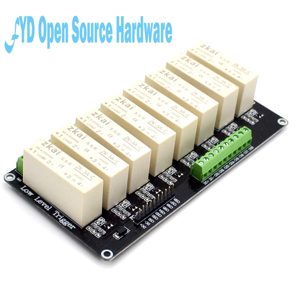 1 с использованием FR-4 двухсторонней печатной платы;2 высокое качество 5А твердотельные реле;3 входные и выходные клеммы используют KF128-3.81 проводки, проводка более удобна;4 Использование транзистора с высоким током SS8050 1.5A в качестве триода переключателя, более стабильное качество;5 с реле переключатель Светодиодная индикация6 монтажных плат имеют 4 отверстия для крепления винтов.Параметры производительности:Источник питания: 3-32VDC (широкий источник питания напряжения)Режим триггера: триггер высокого уровня, 3-32VDC реле Вкл. (вкл.), 0-0,5 В реле ВЫКЛ. (ВЫКЛ.)Ток нагрузки: 5-220VDC 5A (только DC)Размер линейной платы: 68,5x135 мм, высота: 25 ммРасстояние между отверстиями для позиционирования: 63x129,5 мм, диафрагма: 3,1 ммОписание порта подключения:DC +: катод источника питания (3-32VDC)DC-: отрицательный электродCH1-CH8: триггер (3-32VDC высокий уровень триггера эффективный)
