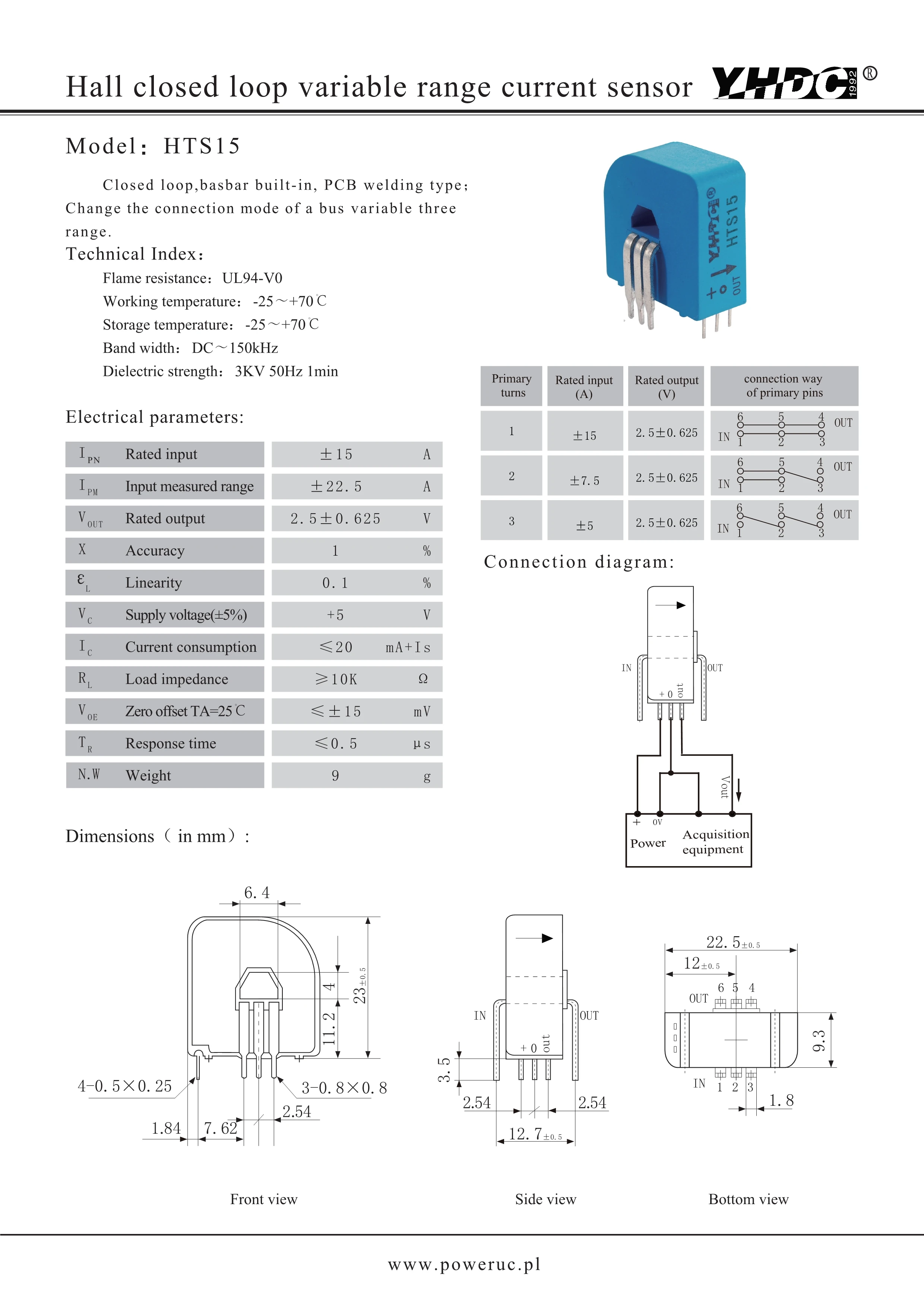 Зал замкнутый шлейф диапазон датчика тока Модель: HTS15 расклассифицированный Входной сигнал: ± 15A Номинальная тепловая мощность: 2,5 ± 0,625 V Точность: 1%