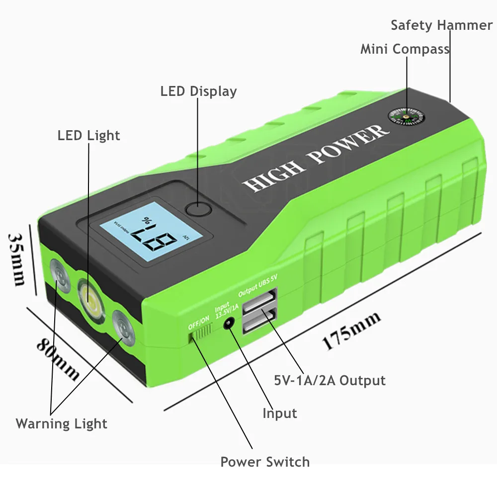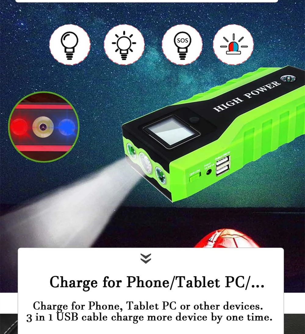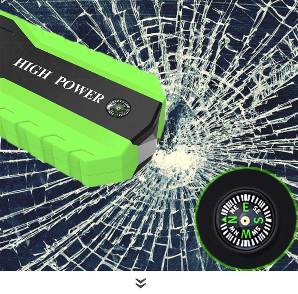 Для того чтобы пусковое устройство, 12V бензиновый автомобиль (до 4.0L) и дизельный автомобиль (до 2.5L) за считанные секунды в тех случаях, когда автомобиль аккумулятор мертвых Многофункциональный внешний аккумулятор, никогда больше не беспокойтесь о вашем смартфоне или планшете, работающем на низком заряде батареи; Молоток безопасности и мини-компас, лучший помощник при аварийной ситуации; Лампа с регулируемой яркостью/стробоскопический/тревога/Предупреждение огни, Предупреждение синих огней, более эффективно, чем Предупреждение Треугольников в случае аварии; Достаточная емкость, маленький размер, тонкий внешний вид.