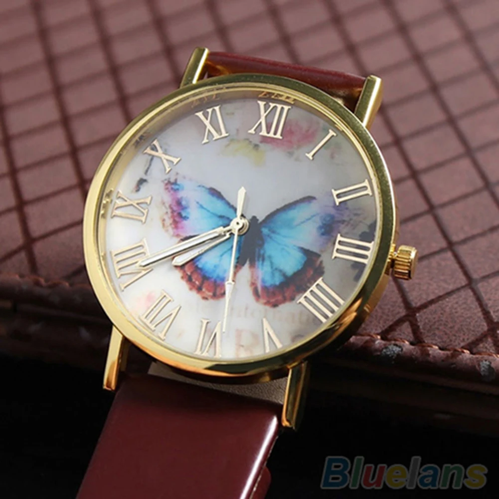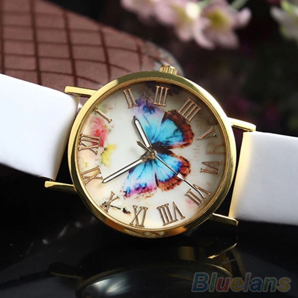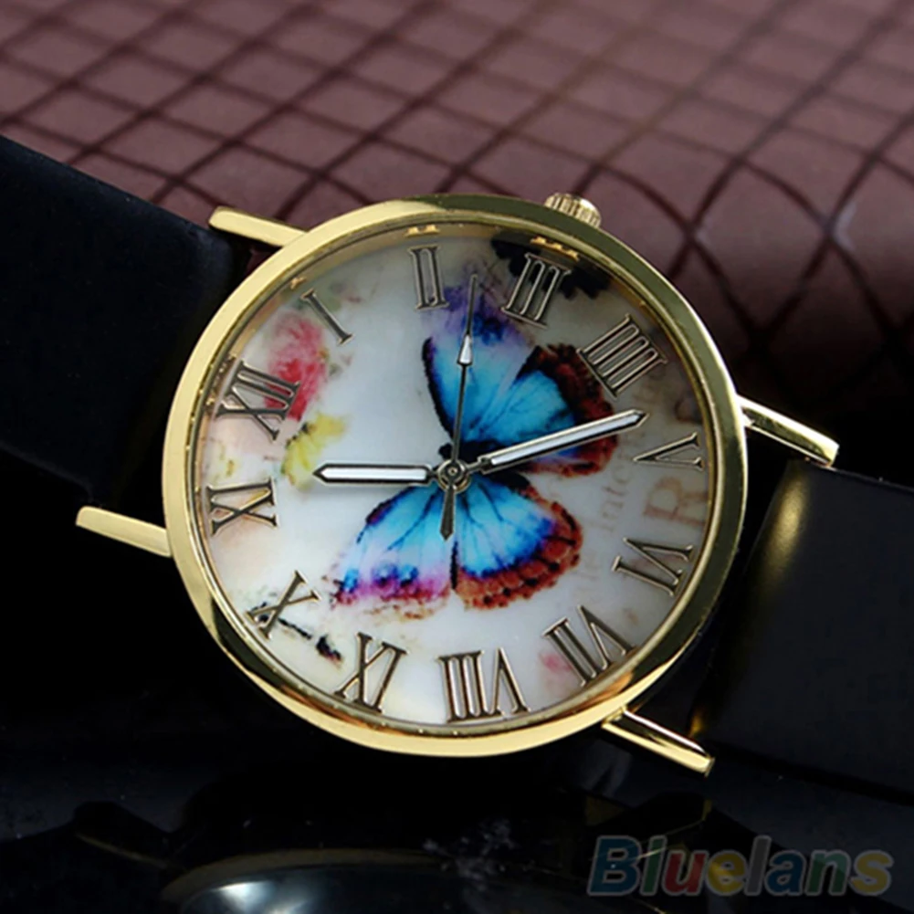 Эти Аналоговые кварцевые наручные часы украшают красочный циферблат с бабочкой, круглый чехол и ремешок из искусственной кожи.