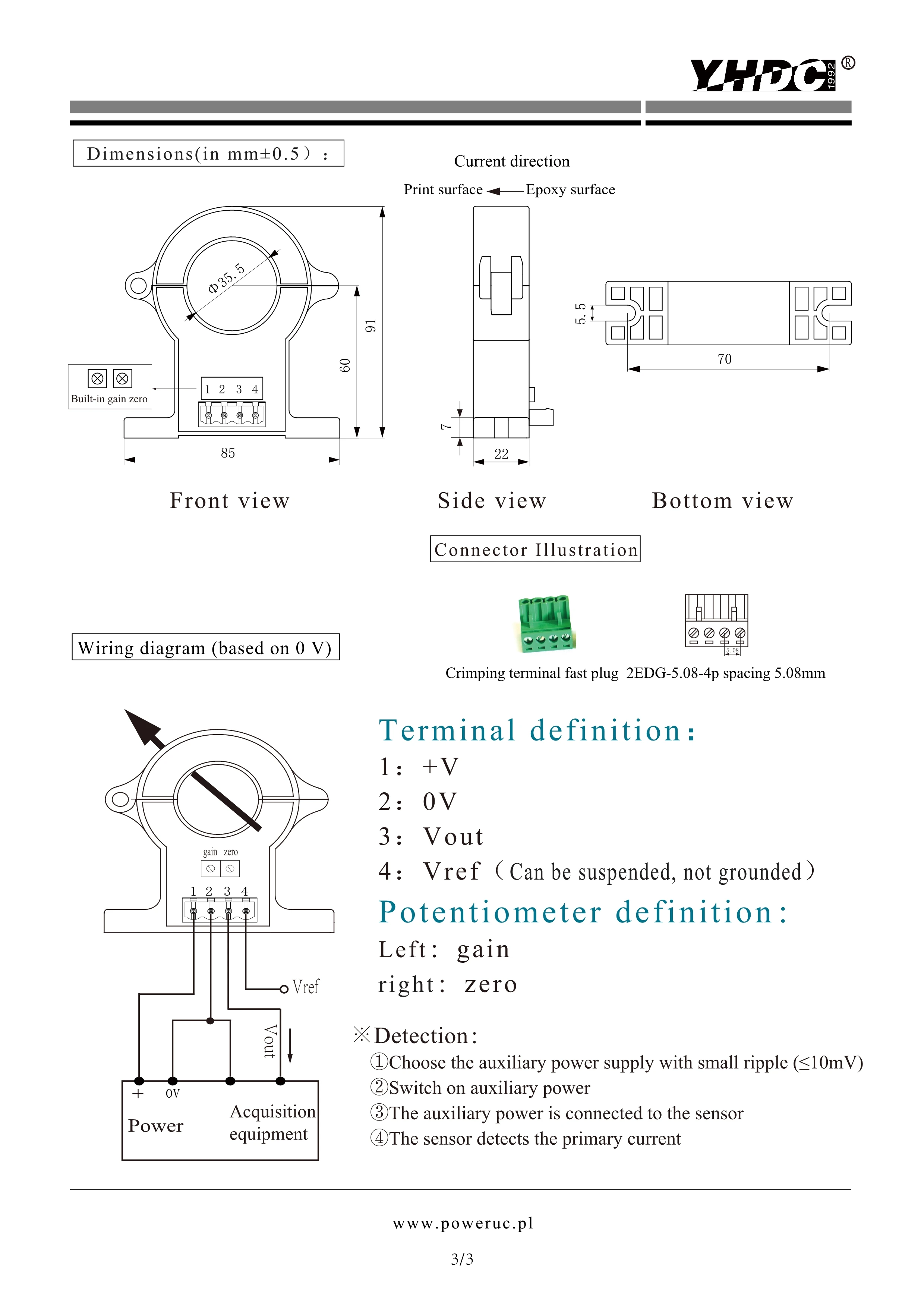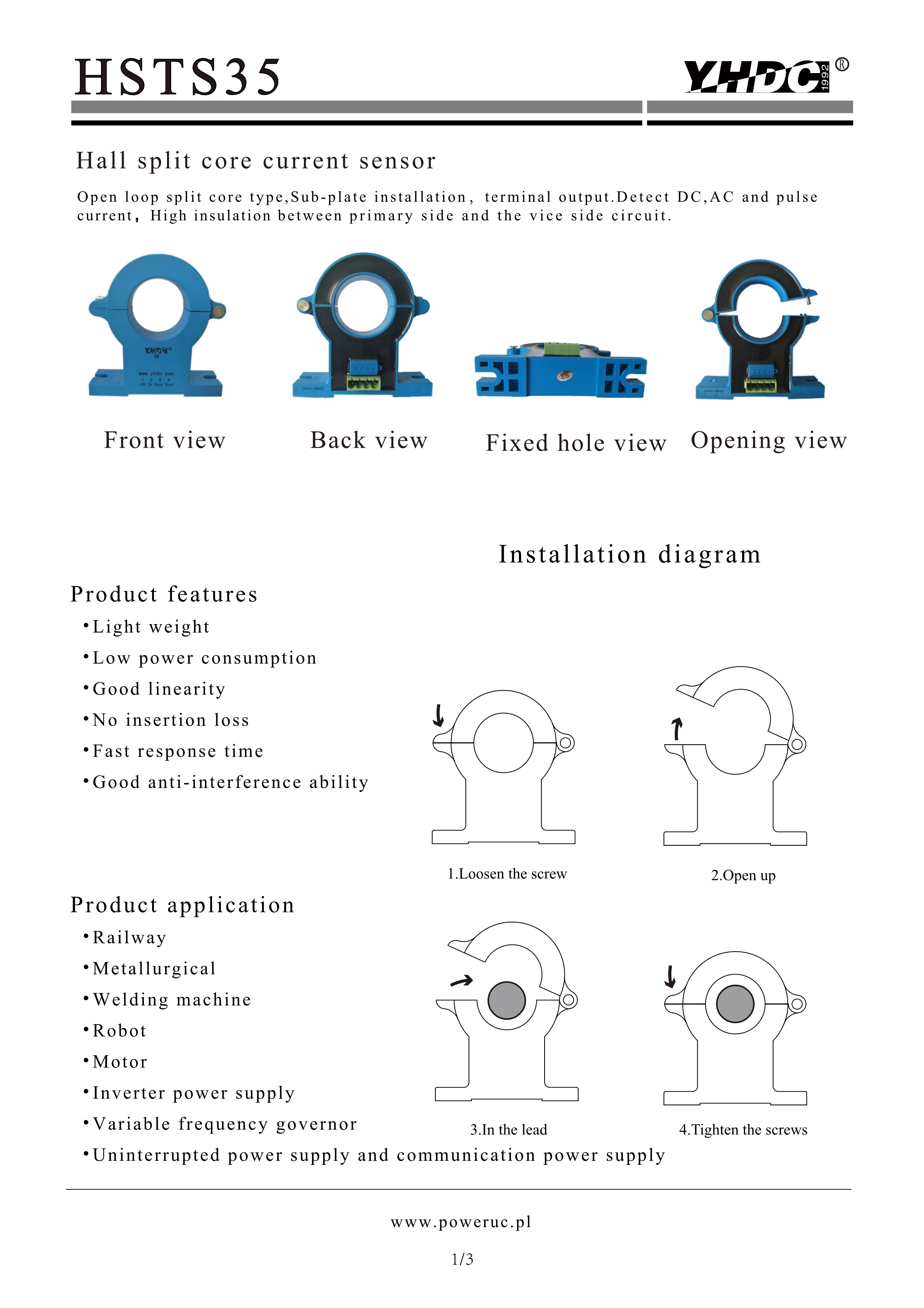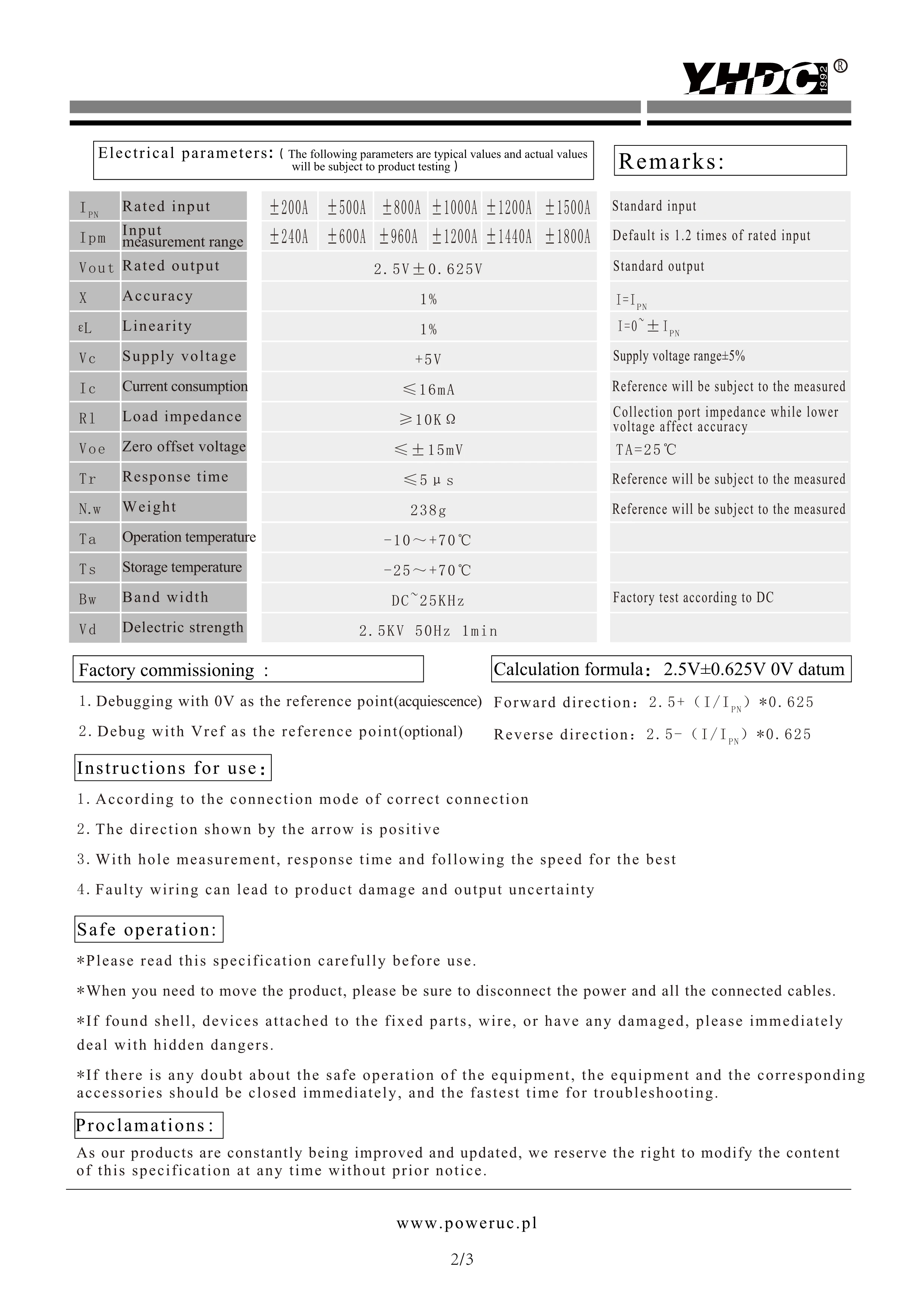 Модель: HSTS35 Номинальный вход: ± 200A ± 500A ± 800A ± 1000A ± 1200A ± 1500AНоминальная тепловая мощность: 2,5 ± 0,625 VТочность: 1%Линейность: 1%Напряжение питания: + 5 ВСпецификация продукта