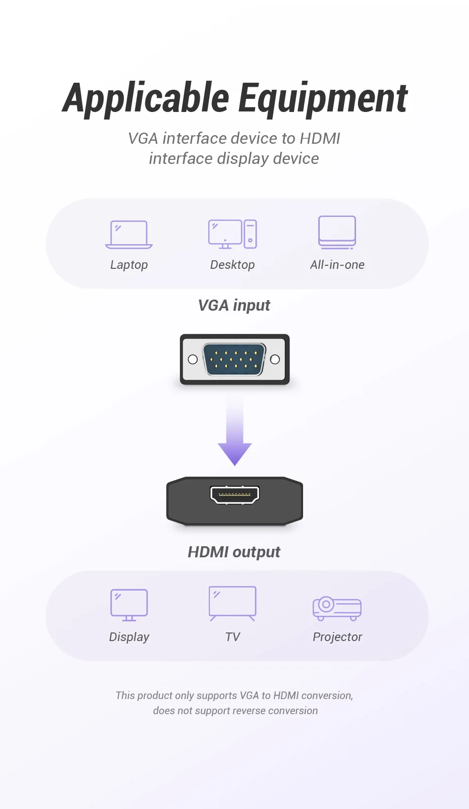 ⭐This product only for VGA single(male & input devices) to HDMI single(female & output devices) way transmission.