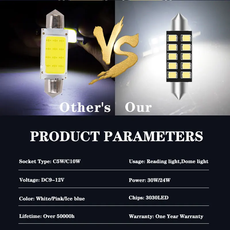 1. Светодиодный чип: высокояркий 2835 smd 2. Напряжение: 12 В постоянного тока 3. Материал: теплоотвод авиационного алюминия 4. Используется для: купольный светильник/лампа для чтения/светильник номерного знака/светильник для багажника 5. Размер: 31 мм (8smd, 36 мм (8smd) ,39 мм (10smd), 41 мм (10smd) 6. Светодиодный Светильник Цвет: чистый белый/розовый/голубой 7. Установка: непосредственно Замените оригинальную автомобильную лампу. 8 、 (чип на плате) Срок службы:> 50000 часов 9. Посылка включает в себя: 1 шт. гирлянда