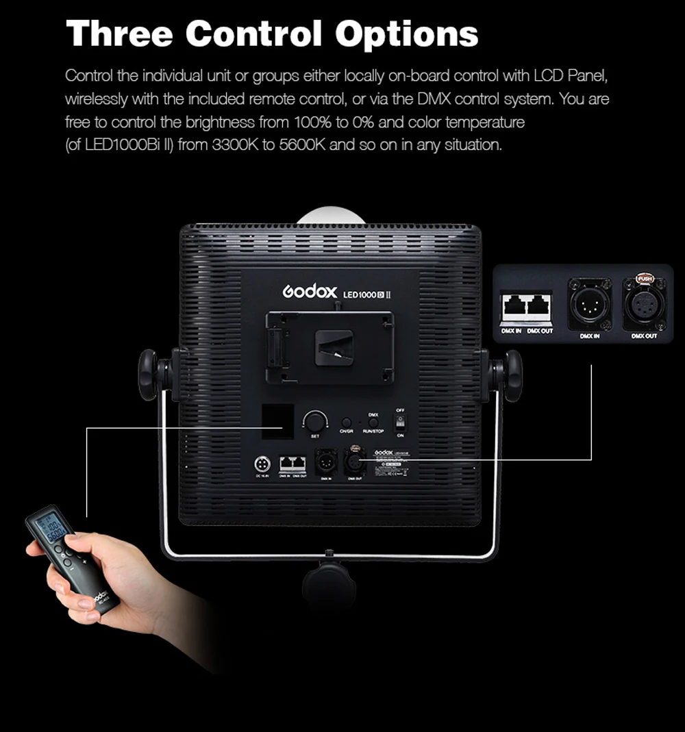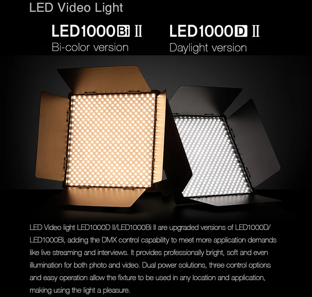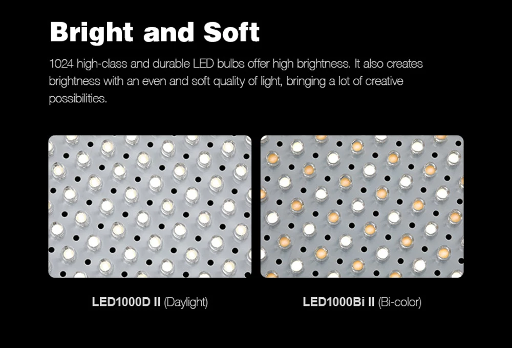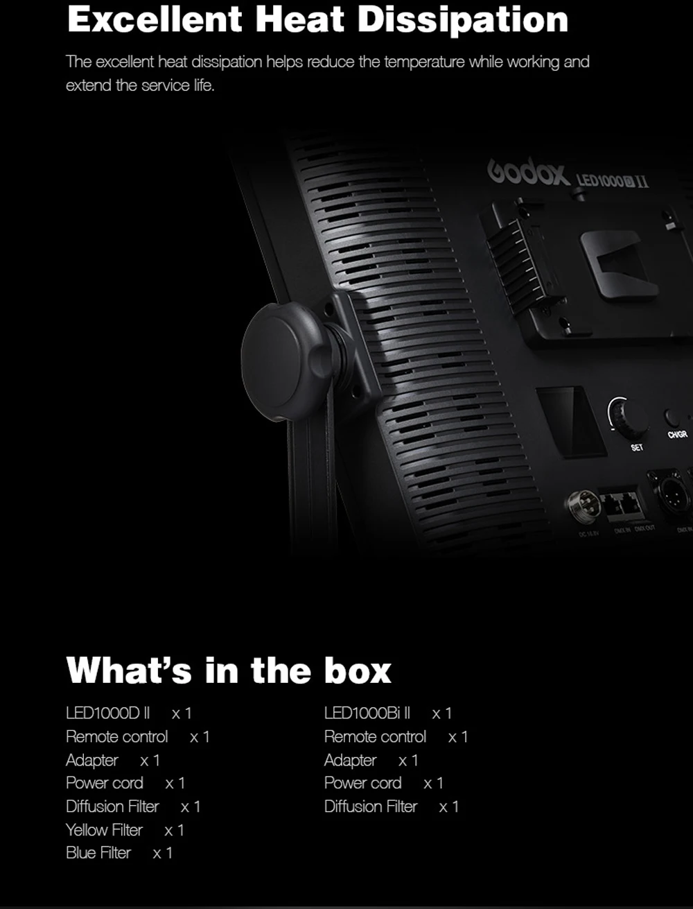 Godox светодиодный 1000Bi/D II имеет 1024 светодиодный бисер и беспроводную регулировку яркости, он отлично подходит для продуктов/портретной съемки, фотожурналистов, видеозаписи и т. д. Он обеспечивает широкий спектр, красиво мягкое и даже освещение для фотографии