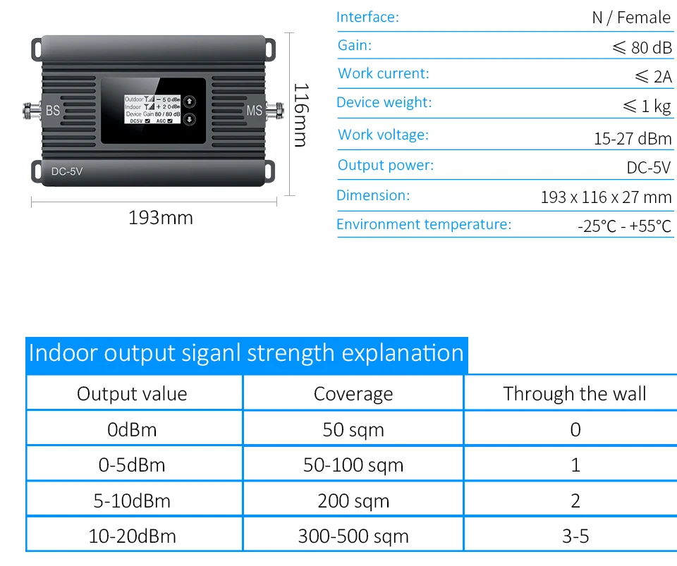 С ALC/AGC Функция Возможность управления усилением автоматически. Избегайте помех базовой станции (Диапазон 3) 1800 МГц-частота передачи сигнала: 1710-1785 МГц/Частота выхода из строя: 1805-1880 МГц Поддержка сети: DCS 4G data Коэффициент усиления: 80 ± 2 дБ Источник питания: 110 В ~ 220 В; Постоянный ток + 5 В/2 А Тип соединителя: N-гнездовой разъем.