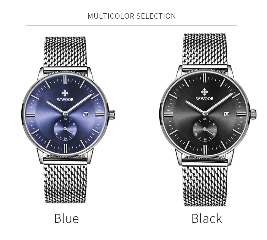 > Посылка в комплекте 1 х WWOOR часы 1 x Ткань для очистки 1 x инструмент для регулировки ремешка часов Характеристики (прибл.): Чехол Диаметр: 3,9 см Чехол Толщина: 1,15 см. Ширина ремешка: 2 см Группа Длина: 23,5 см Материал ремешка: нержавеющая сталь Водонепроницаемый 3 АТМ/30 м Функция отображения календаря и небольшой циферблат