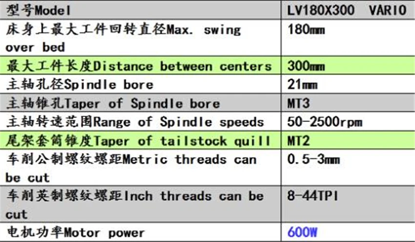 Расстояние между центрами: 300 ммМаксимальный диаметр свинга заготовки: 180 ммКонус Sindle: MT3Изменение скорости: Плавное регулирование скоростиДиаметр отверстия шпинделя: 21 ммИнструмент слайд ход: 50 ммКонус хвостового хвоста: MT2Ассортимент в метрической резьбы: 0,5-3 ммДиапазон дюймовых нитей: 10-44TPLХод поперечной стороны: 75 ммХод задней крышки: 60 ммТочность шпинделя: 0,01 ммСкорость вращения шпинделя: 50-2500 об/минНапряжение/частота: 230 В/50 Гц или 120 В/60 ГцДвигатель: 600 ВтВес нетто: 60 кг Считывание скорости цифрового шпинделяПеременная скоростьМощный двигатель постоянного токаБыстрый замок задняя крышкаЗащита от избыточной мощностиИндукционная затвердевающая кровать Этот прецизионный мини-токарный станок предназначен для выполнения различных типов обрабатывающих пробок.Контр-турминг, бурение. Резьбы. И резка рабочих мест на материалах, состоящих из круглыхБар и материалы могут быть выполнены с этой машиной может быть usde в таких областях, какМини-точная обработка деталей, обработка образцов и модульная работа.Эта машина является цифровой индикации скорости redout мини-токарный станок.Примечание: