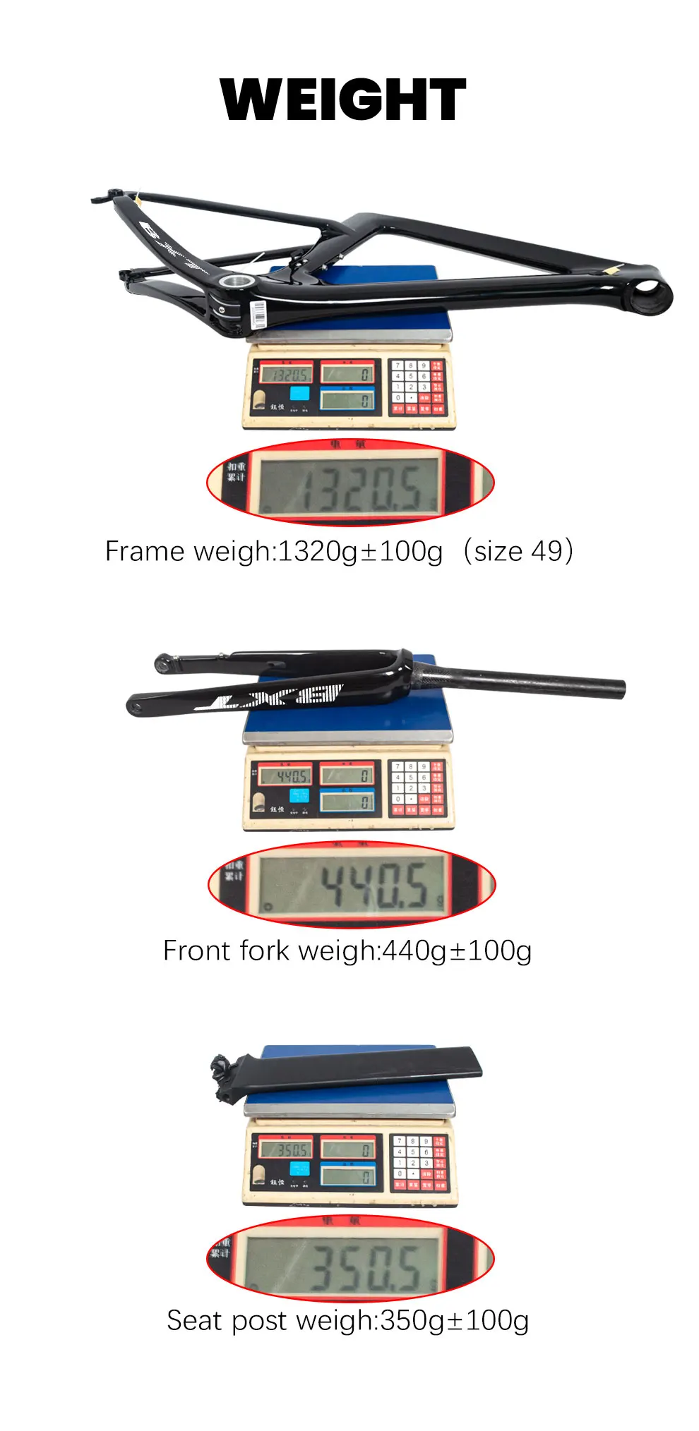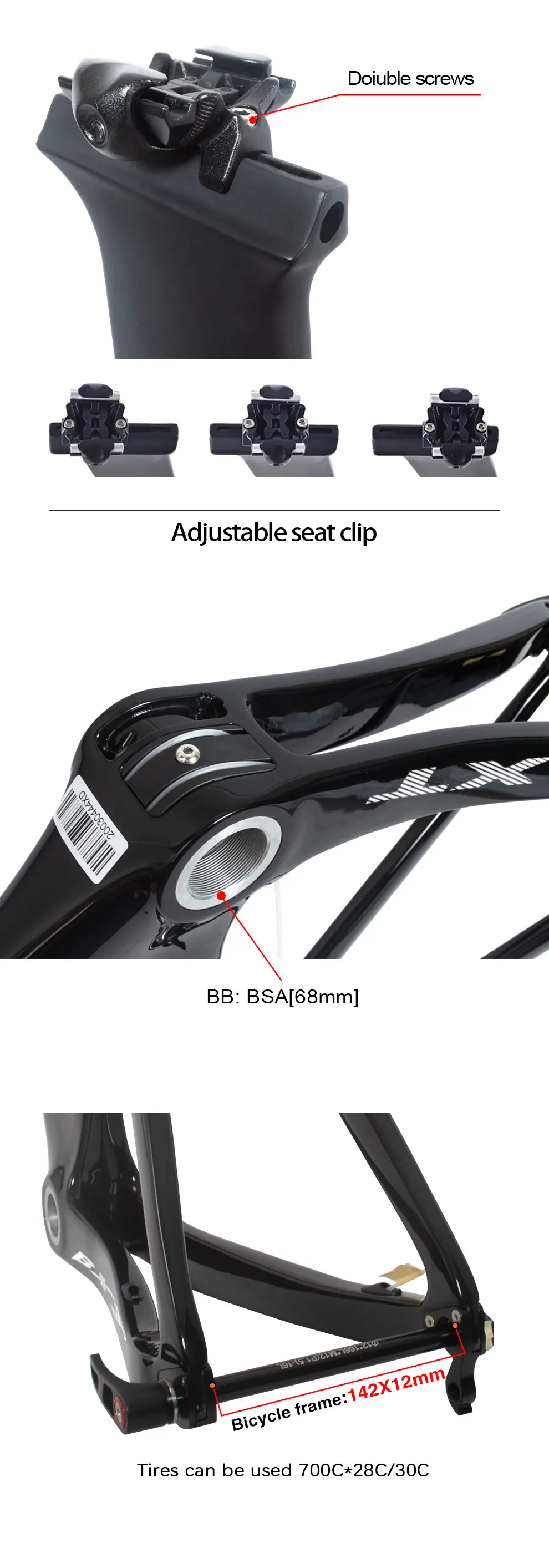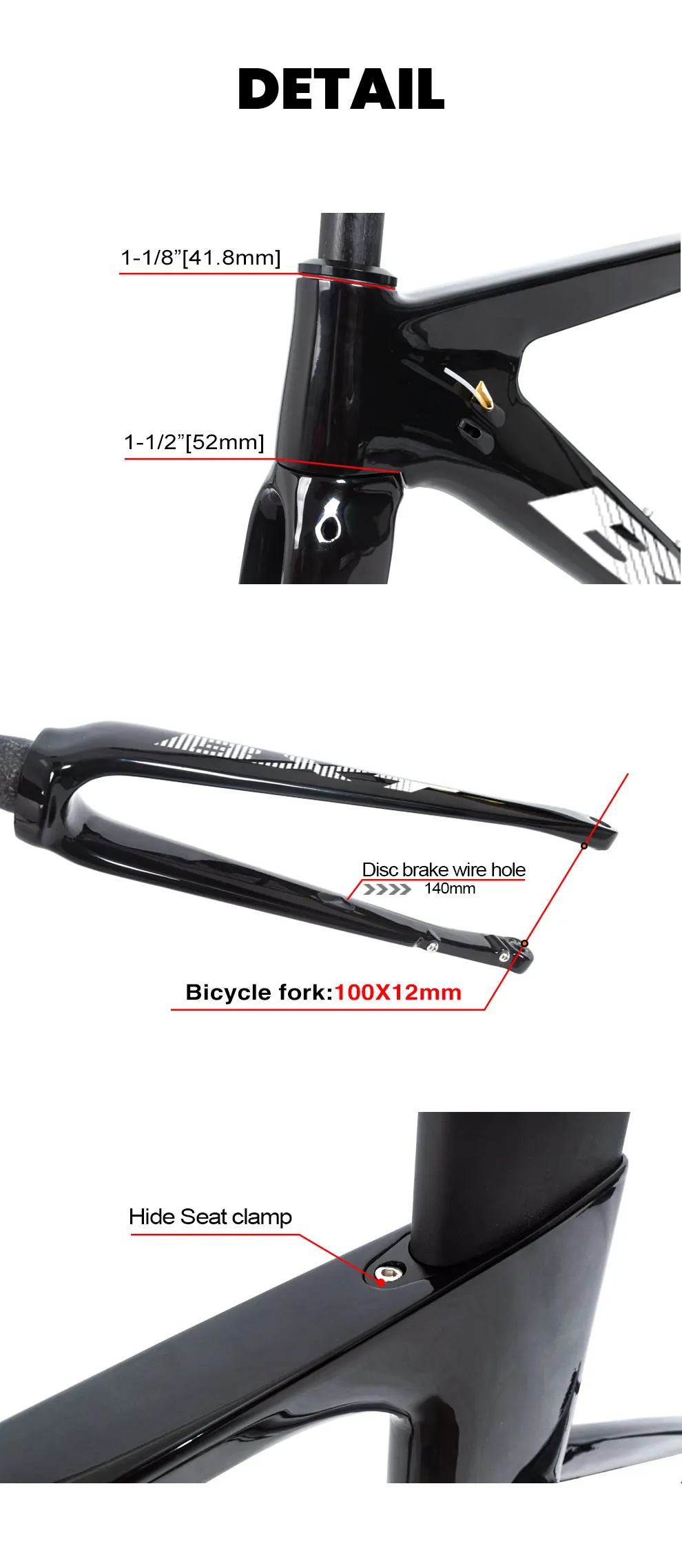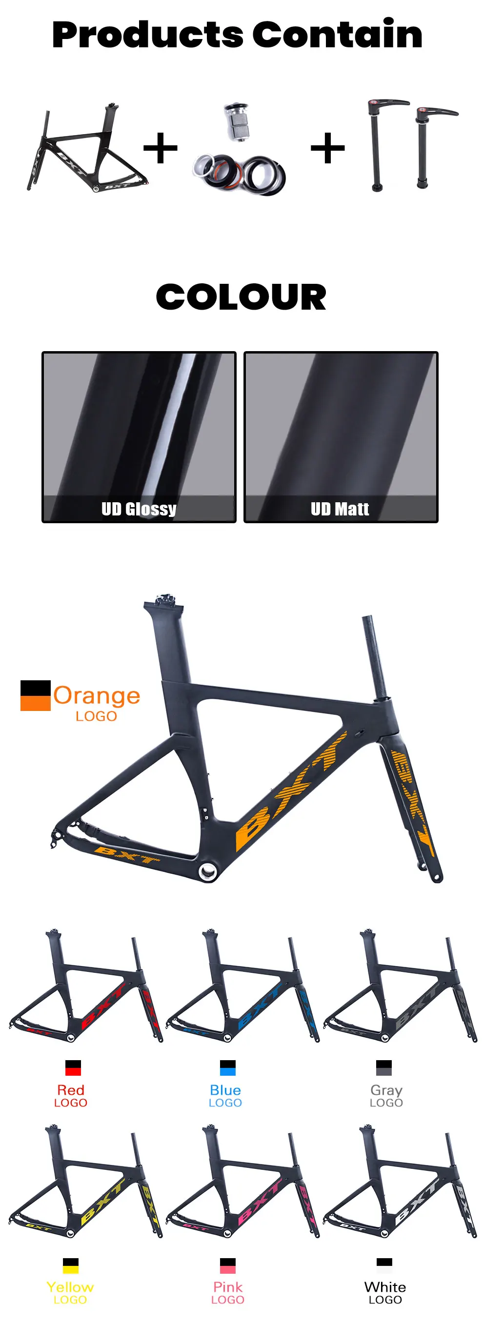 Модель: BXT-075 Тип: карбоновая рама для дорожного велосипеда Вес рамы: 1320 г ± 100 г (размер 49) Передняя вилка весит: 440 г ± 100 г Вес стойки сиденья: 350 г ± 100 г Материал: карбоновая рама T800 Размер: 49/51/54 см Тормозная система: дисковый тормоз 140 мм Отделка: глянцевая/матовая Продукт содержит: рама + вилка + подседельный штырь + гарнитура + сплав через ось быстро
