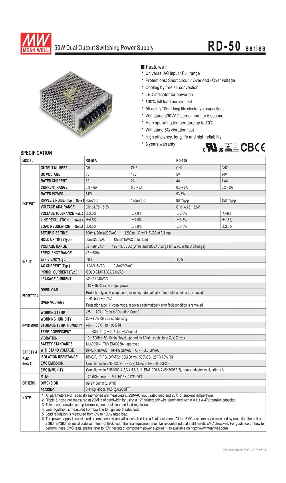 Оригинальный бренд Mean well представляет RD-50B 54W 5V 24V двойной Выход Meanwell Питание