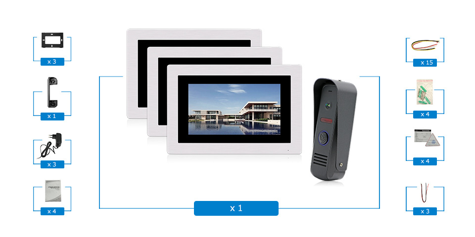 С помощью проводного видеодомофона Jeatone 7 "с сенсорным экраном, посетитель может использовать звонки на панели вызова и использовать внутренний монитор разблокировки, мониторинга, внутренней связи, фотографирования и записи видео.