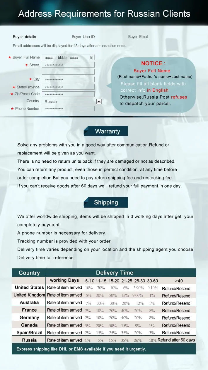 Если по другой причине вы хотите отправить его нам, вы будете нести ответственность за возврат стоимости доставки, и мы отправим замену после получения возвращаемого товара.