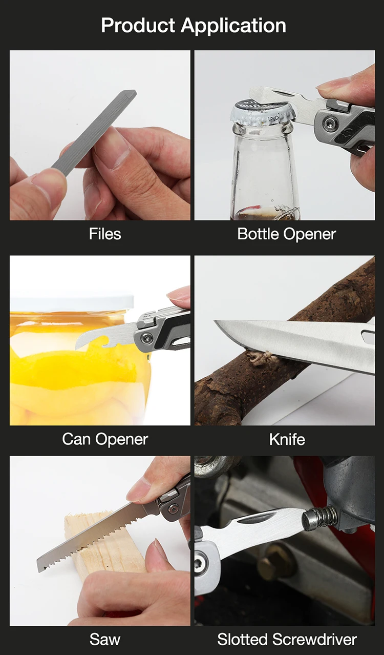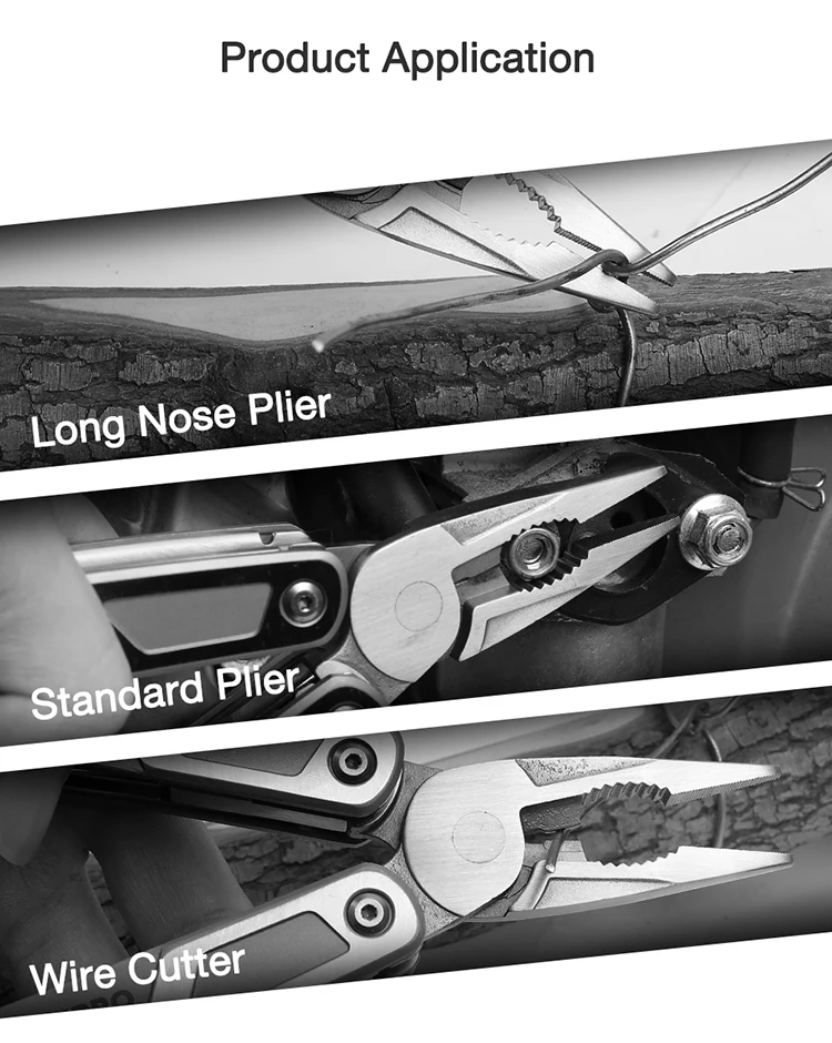 На головке инструмента есть Длинные плоскогубцы, изогнутые плоскогубцы, резец проволоки в верхней части v-образного резака и резец из жесткого провода в нижней части v-образного резака.
