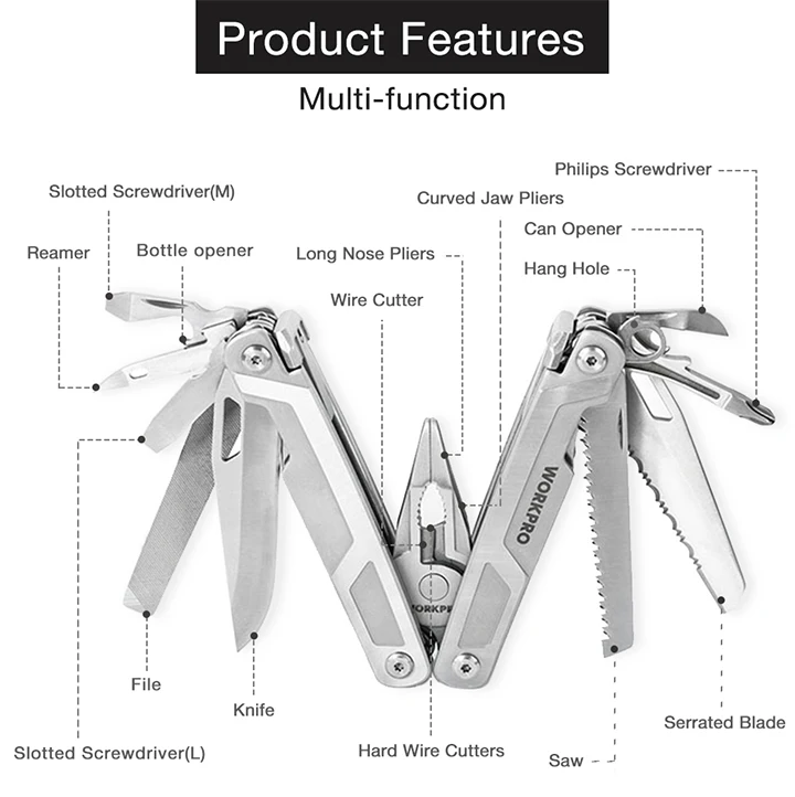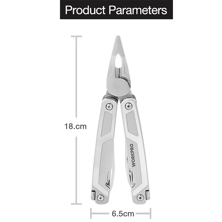 Жесткий, надежный и простой в обращении, вот что мы хотели разработать и, наконец, представлено на этом Workpro сверхмощном многофункциональном инструменте. Простой стиль и качественная конструкция делают этот многофункциональный инструмент безупречным в самых сложных и неблагоприятных условиях. 16 в 1: Плоскогубцы с длинным носом Резак для проволоки Изогнутые плоскогубцы Подвесное отверстие Консервный нож Устройство для зачистки проводов Отвертка Philips Зубчатое лезвие Пила Твердосплавные резцы Нож и пилка Шлицевая отвертка Расширитель Открывалка для бутылок Шлицевая отвертка