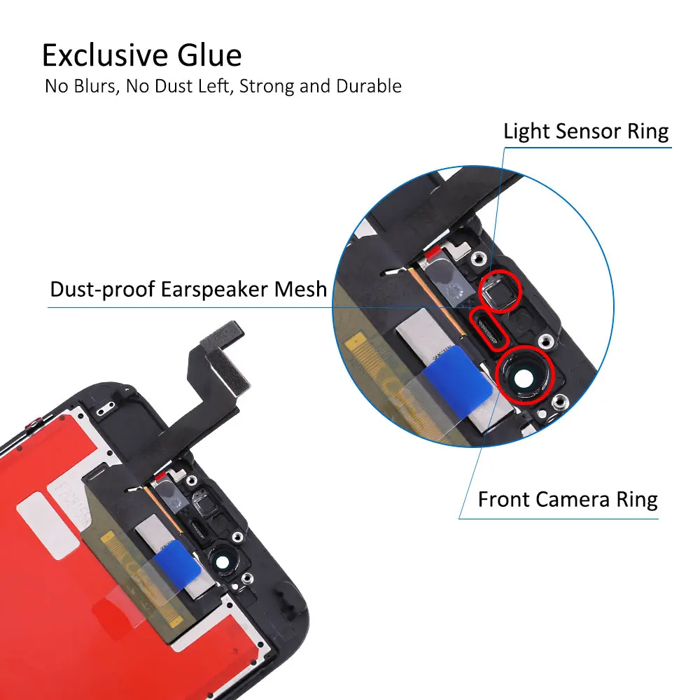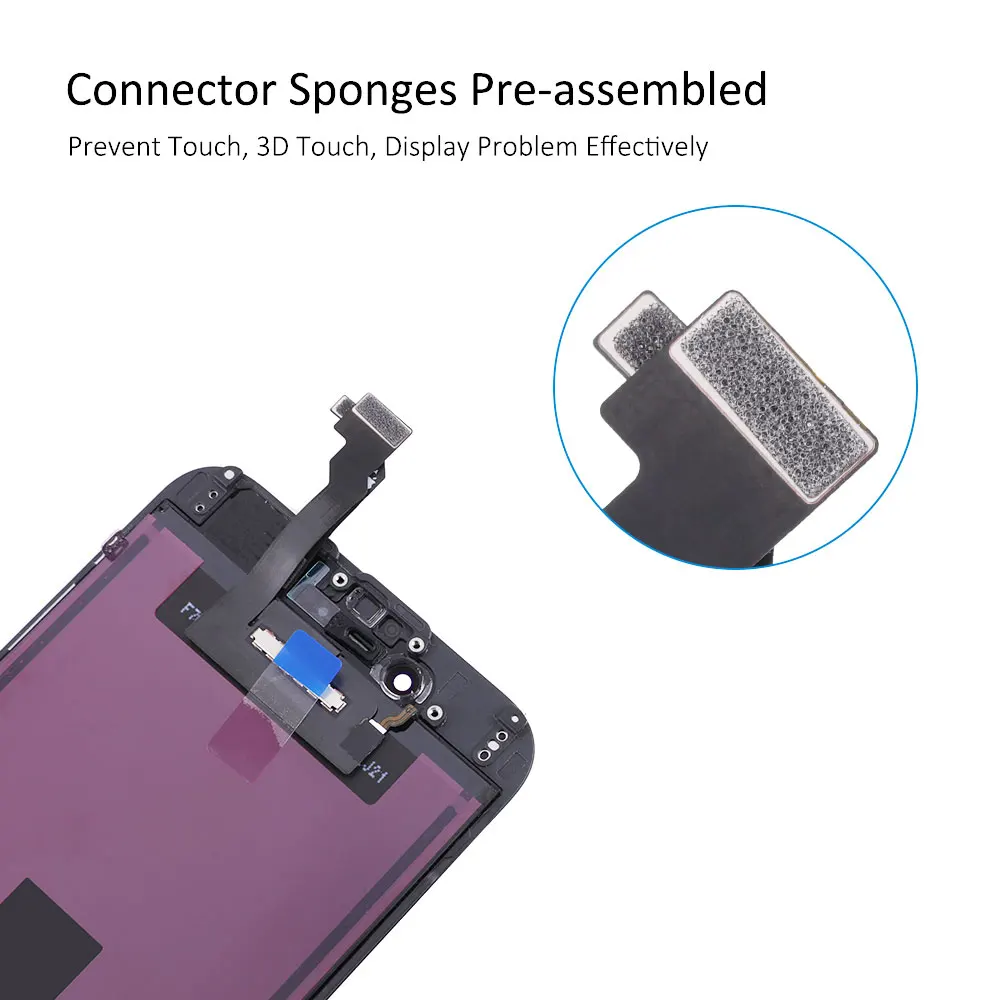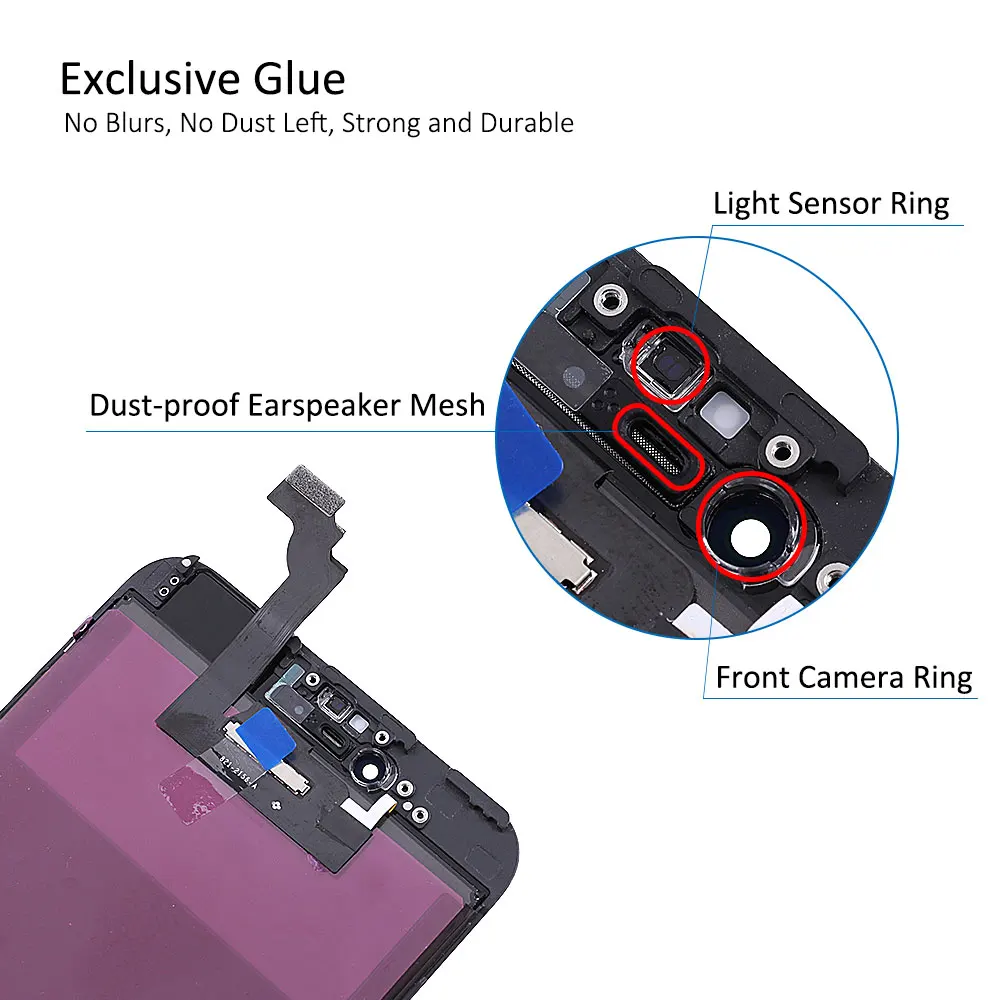 1. Детали: внешнее стекло + ЖК-экран + сенсорная панель дигитайзера + Переднее кольцо для камеры + Датчик-светильник + Пыленепроницаемая сетка для ушей, предварительно собранная. 2. Материал: пластик подходит для iPhone 5/7/7Plus/8/8Plus 3. Контроль качества: Каждый экран был протестирован перед отправкой и работает на 100%. 4. Посылка: поставляется с антистатической сумкой + пузырчатой сумкой, безопасной упаковкой. 5. Гарантия: мы предлагаем гарантию на 6 месяцев (гарантия аннулируется, если ЖК-дисплей/гибкий кабель/Рама повреждена после установки или во время установки).