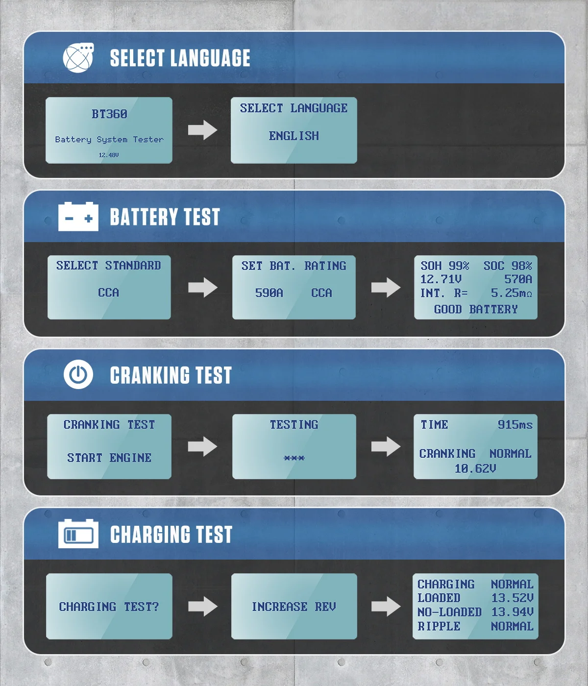 Три функции тест операции шаги AUTOOL BT360 автомобиль батарея нагрузочный тест er