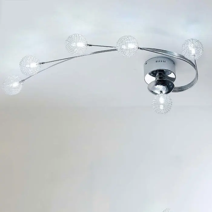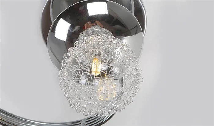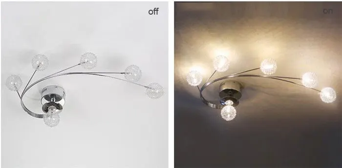 Материалы: нержавеющая сталь, стекло, алюминиевая проволока Входное напряжение: 100-240 В переменного тока 50/60 Гц Источник света: 6 шт. G4 лампа --- светодиодный светильник в комплекте Способ крепления: потолочный Режим управления: настенный выключатель Площадь освещения: 15 м ^ 2 до 20 м ^ 2