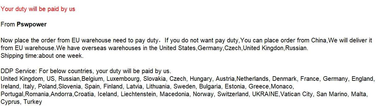 1 год (на основе данных о покупке): бесплатный ремонт, покупатель оплачивает почтовые расходы на возврат и повторную отправку, покупатель должен вернуться в Италию для ремонта, не нужно возвращать в Китай.