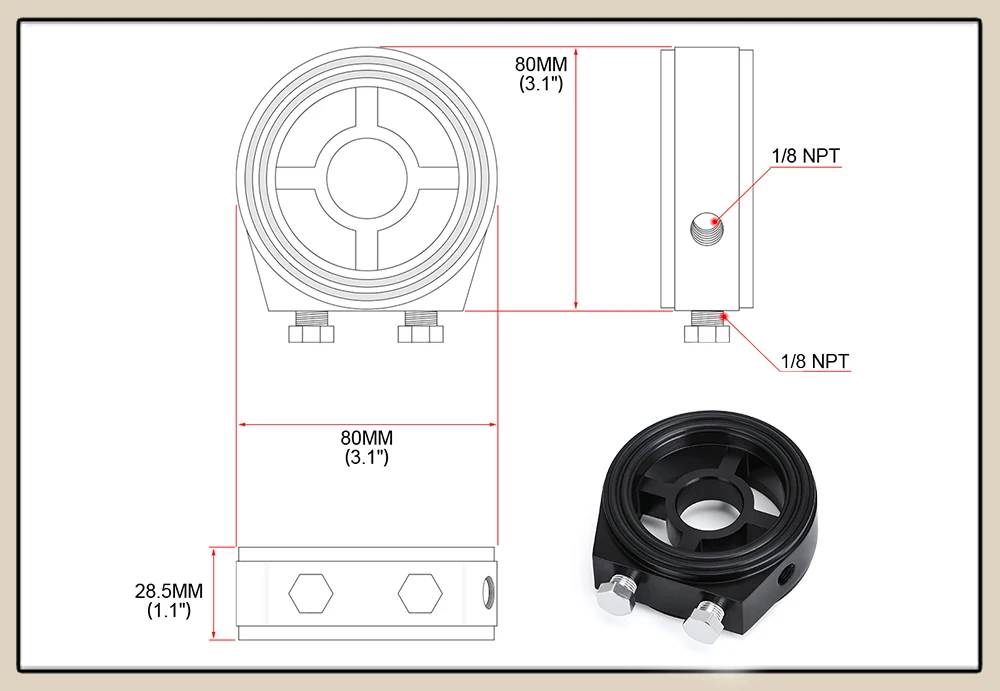 Габаритные размеры: 3,06 "(диаметр) x 1,28" (толщина). Диаметр впуска: 10AN/Диаметр выхода: 10AN. Размер монтажной гайки байпасного порта: 3/4-16 UNF/M20 x 1,5. Размер резьбы сенсорных вставок: 1/8 NPT. Цвет:Серебряный, синий, черный, золотой, фиолетовый, красный Изготовлен из оружейного алюминиевого сплава.УпаковкаВ комплекте: