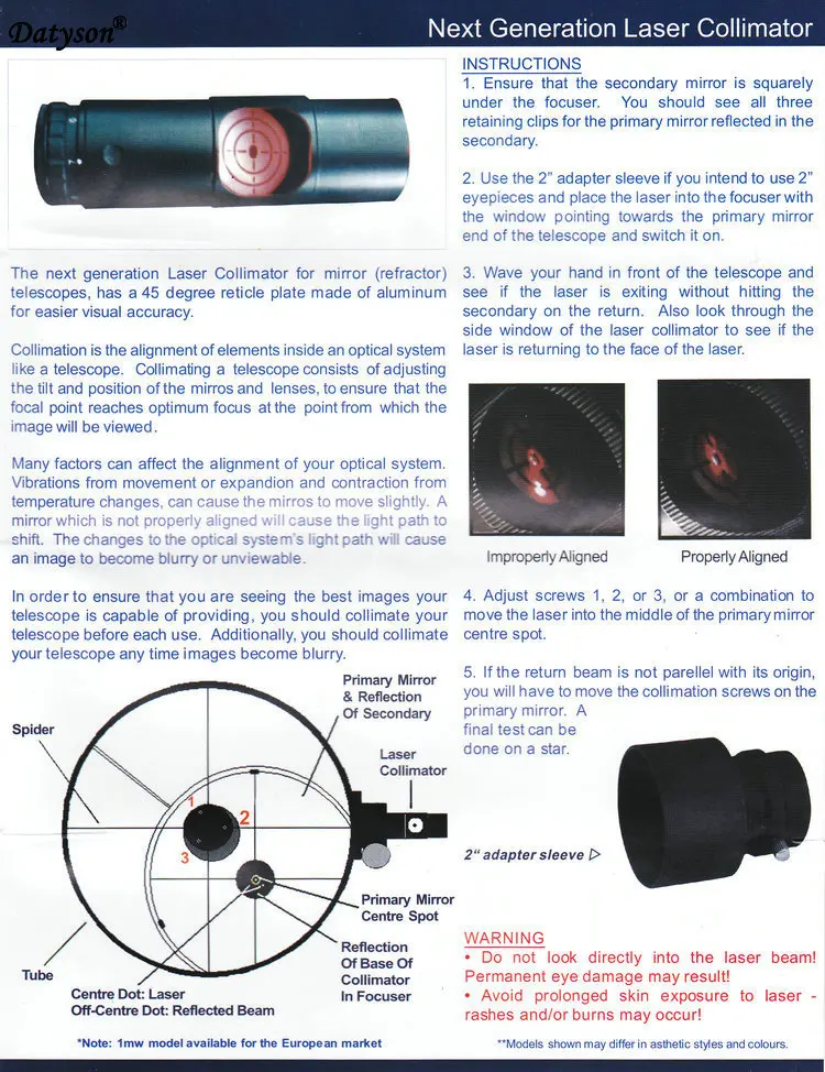 3. Многие факторы могут повлиять на выравнивание вашей оптической системы и могут привести к небольшому перемещению зеркал, например, вибрации от движения или расширения и сжатия от изменения температуры. Зеркало, которое не выровнено должным образом, приведет к смещению траектории на светильник. Изменение траектории на светильник оптической системы приведет к размыванию изображения или невидению. Для того, чтобы убедиться, что вы видите лучшие изображения, которые может предоставить ваш телескоп, вы должны collimate вам телескоп перед каждым использованием. Кроме того, вы должны collimate ваш телескоп в любое время изображения становятся размытыми. Этот лазерный коллиматорный является проектируют секцию освещения с использованием дневных огней в 1,25 дюймов фокусер.