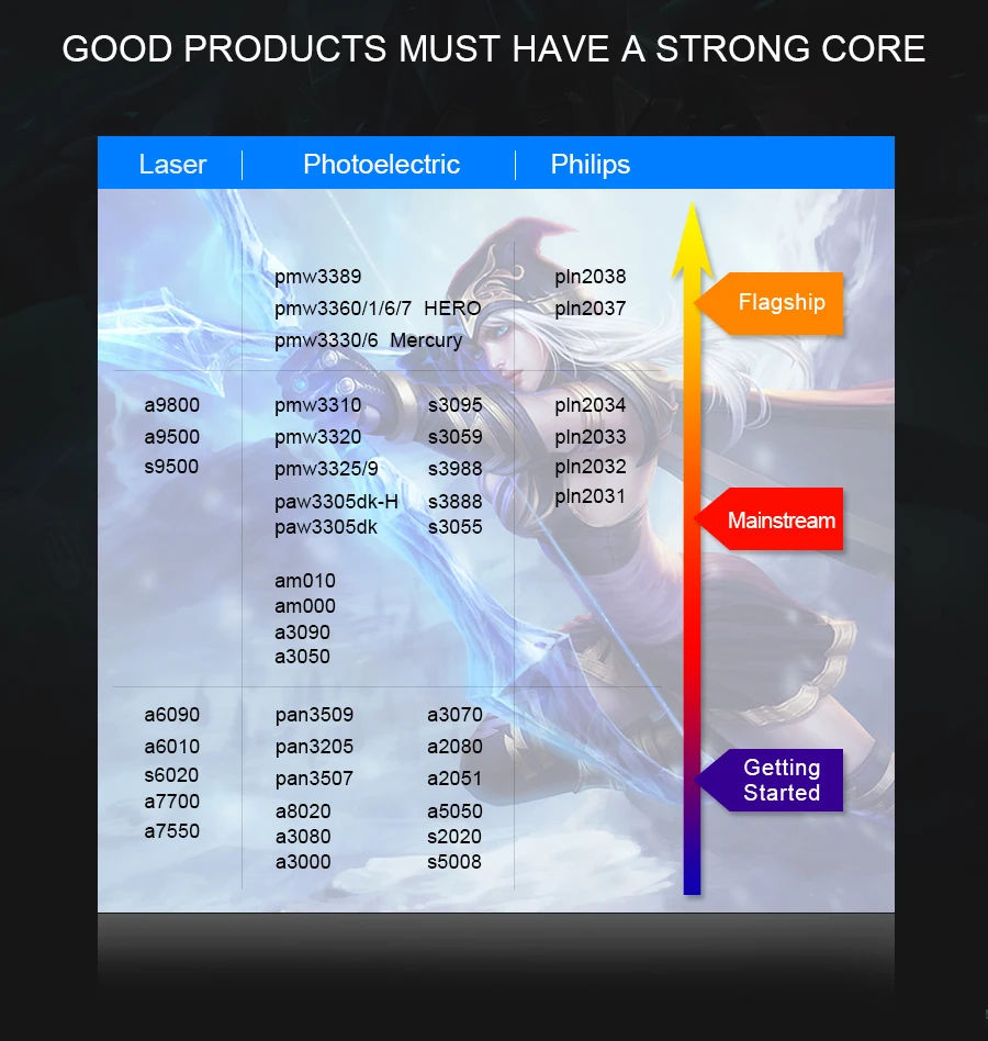 Основная модель нашей мыши P3360, которая является лучшим ядром; >30GACC.12000 FPS; Частота опроса 1000Hz; Скорость курсора 100-150in/s