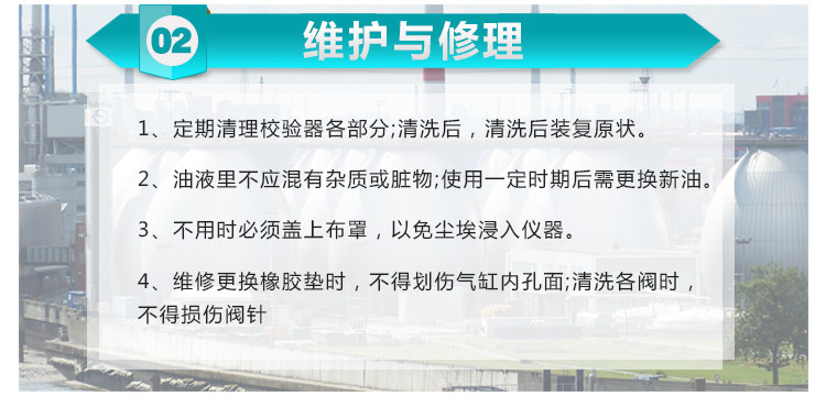 Установка и использование 1. Калибровочная таблица должна быть размещена на рабочем столе, который прост в эксплуатации и должен быть сохранен на уровне. 2. Температура рабочей среды калибровочной таблицы составляет + 20 ± 10 ℃, и окружающий воздух не должен содержать коррозионные газы. 3. Калибровочный стол не должен быть разряжен; Резиновые коврики должны быть установлены на рабочем столе. 4. Перед использованием сначала очистите трубопровод калибровочной таблицы с помощью бензина, а затем заполните масляный стаканчик с помощью передающей среды давления. Поверните ручное колесо ручного винта, чтобы проверить, разблокирована ли масляная цепь; Если нет проблем, вы можете установить точный манометр и калиброванный манометр. Техническое обслуживание и ремонт 1. Регулярно очищайте все части калибратора; После очистки восстановите состояние после очистки. 2. Масло не должно смешиваться с примесями или грязью; Его следует заменить новым маслом после определенного периода использования. 3. Когда не используется, крышка ткани должна быть покрыта, чтобы предотвратить попадание пыли в инструмент. 4. При ремонте и замене резиновой прокладки не царапайте поверхность внутреннего отверстия цилиндра; Не повреждайте иглу клапана при очистке клапанов
