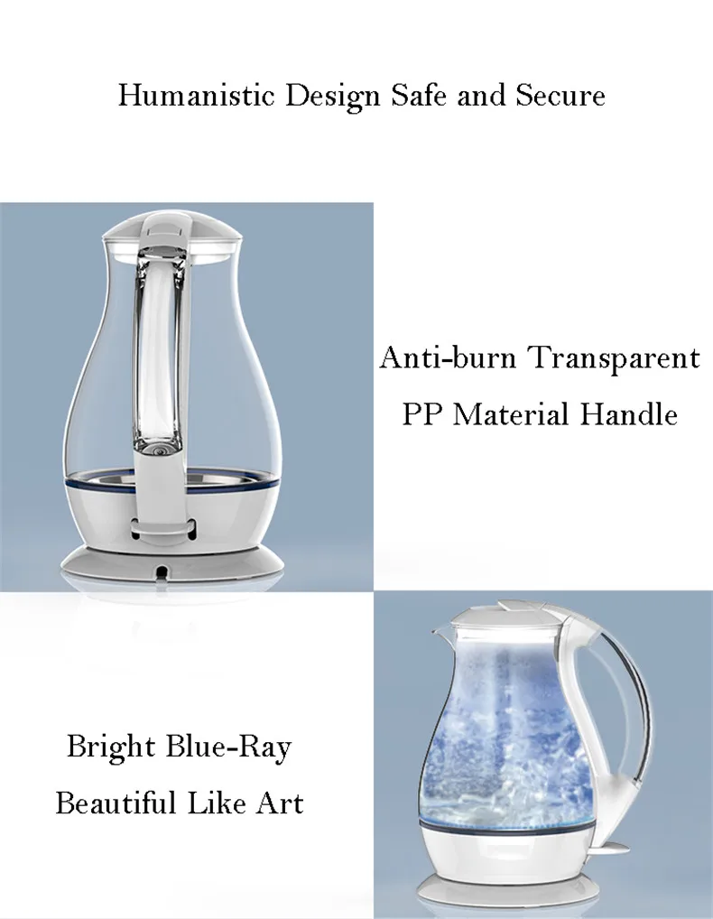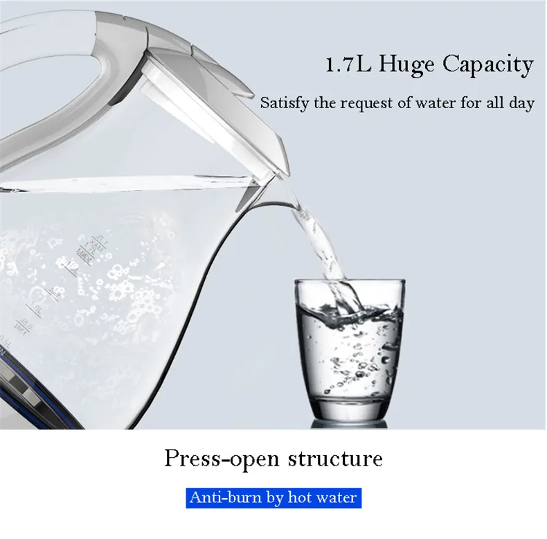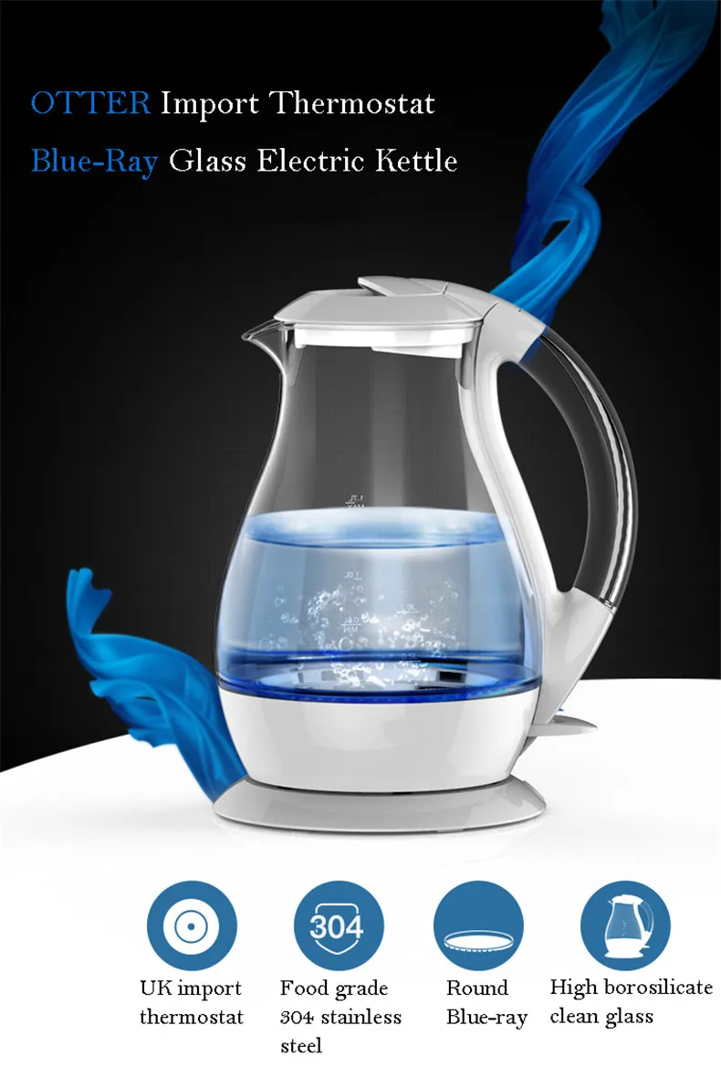 Название: Электрический чайник Модель: LD-K1001 Напряжение: 220 В/50 Гц Мощность: 1800 W Ёмкость: 1.7L Длина провода: 75 см Материал: высококачественное Боровое стекло + пищевая нержавеющая сталь 304 Размеры: 22 см * 17,2 см * 27 см