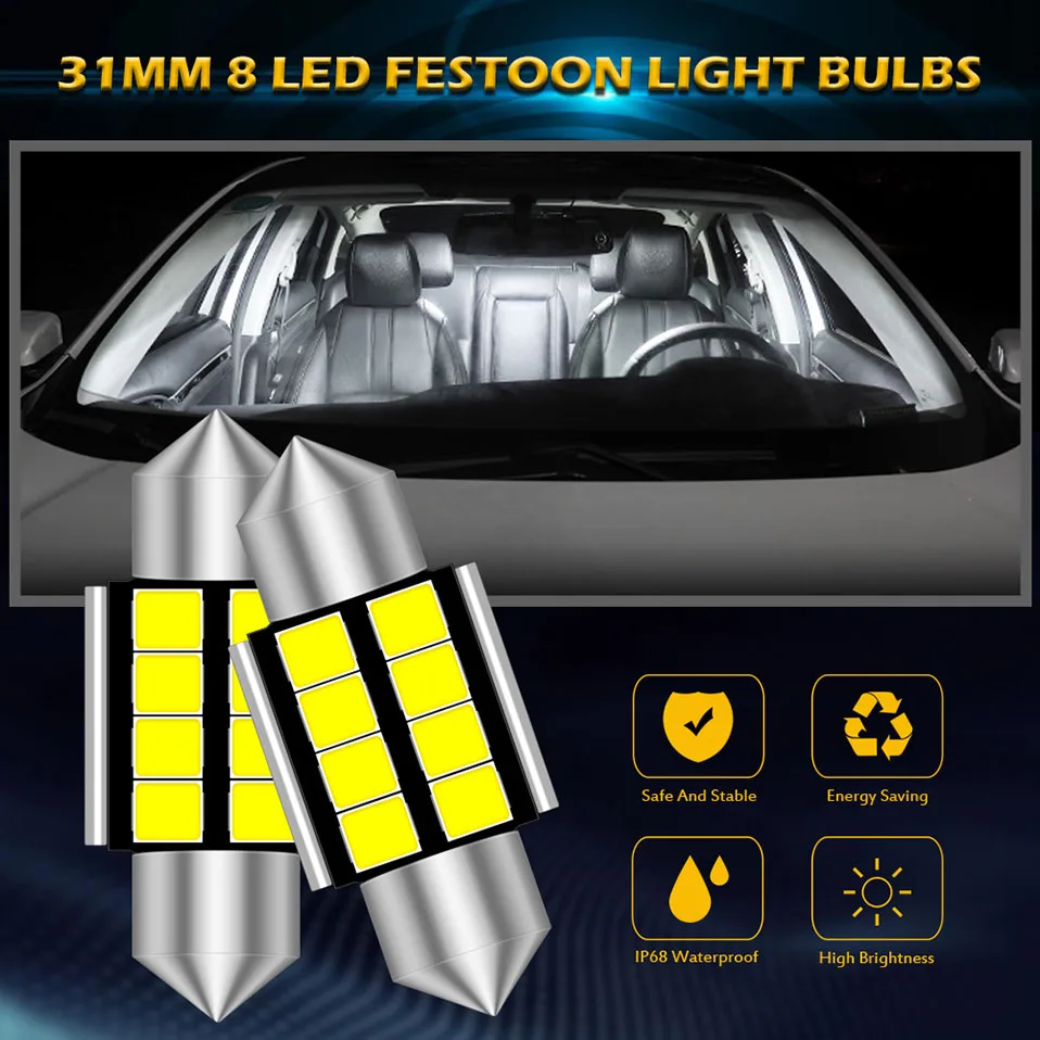 В наличии Напряжение: DC9V ~ 16В Заменить: C5W светодиодный C10W светодиодный Размер: Длина: 31 мм, 36 мм, 39 мм, 41 мм Тип SMD: 2835 SMD Световой поток: 360Lm Использование: светильник для чтения, купольный светильник, светильник карты, сигнальный светильник и т. д. Примечание: подходит для светодиодных гирлянд 30-41 мм.