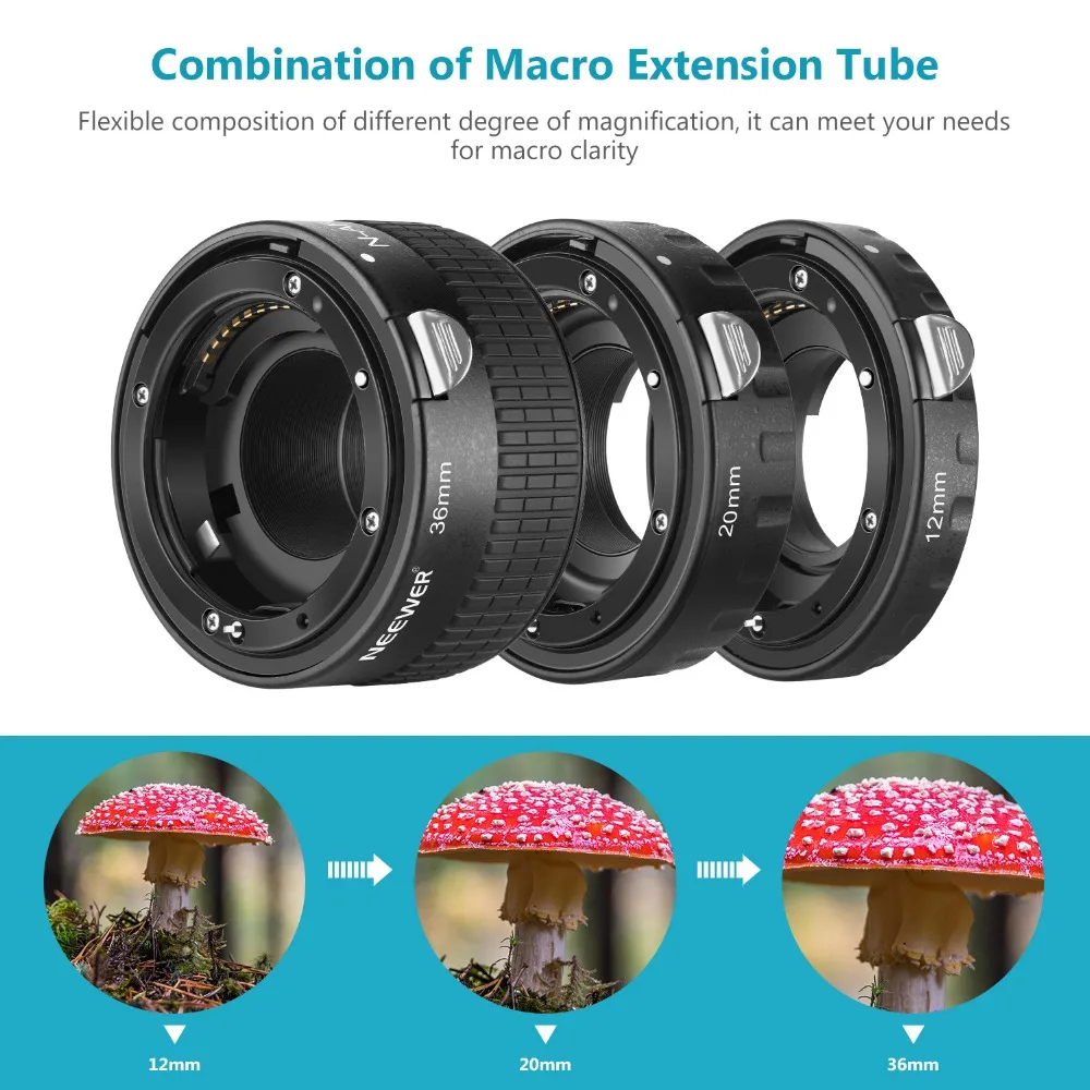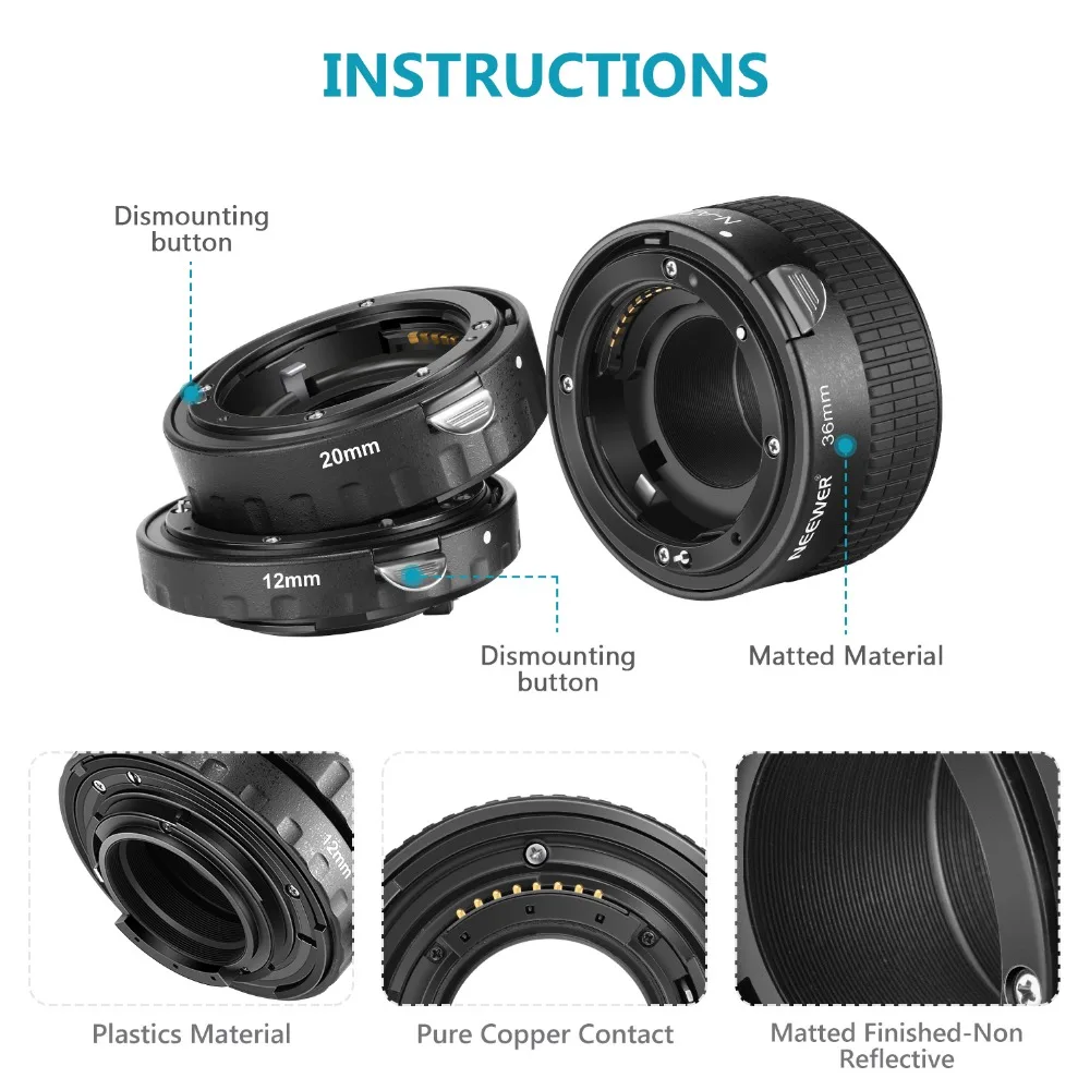 Neewer®12 мм, 20 мм, 36 мм AF Автофокус ABS Набор удлинительных трубок для Nikon DSLR камер, таких как D7200,D7100,D7000,D5300,D5200,D5100,D5000,D3300,D3200NEEWER является зарегистрированным товарным знаком. Только уполномоченный продавец NEEWER может продавать товары по категории NEEWER.Описание: