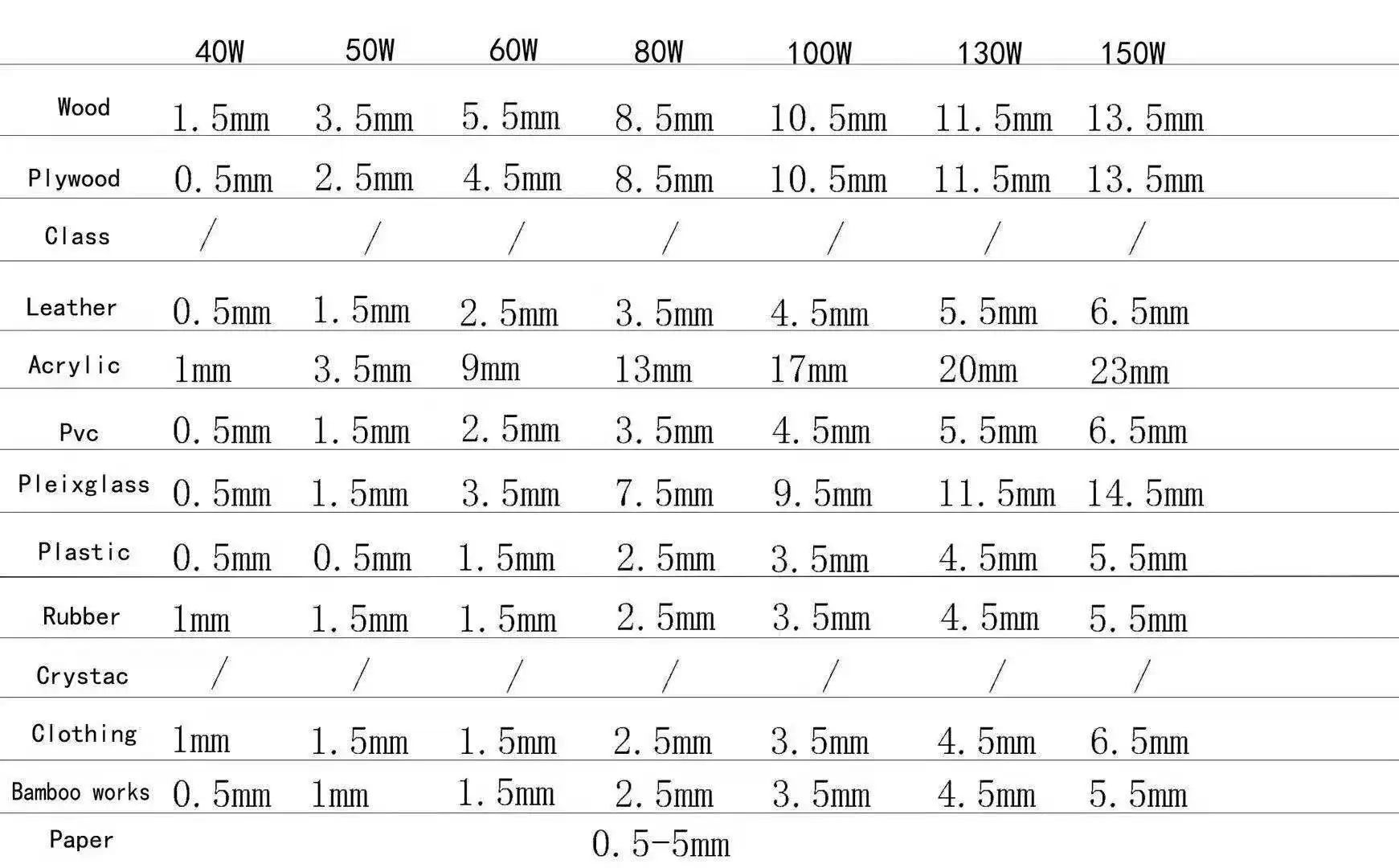 Size InformationCutting depth of different power and material.Please choose the product according to your needs.