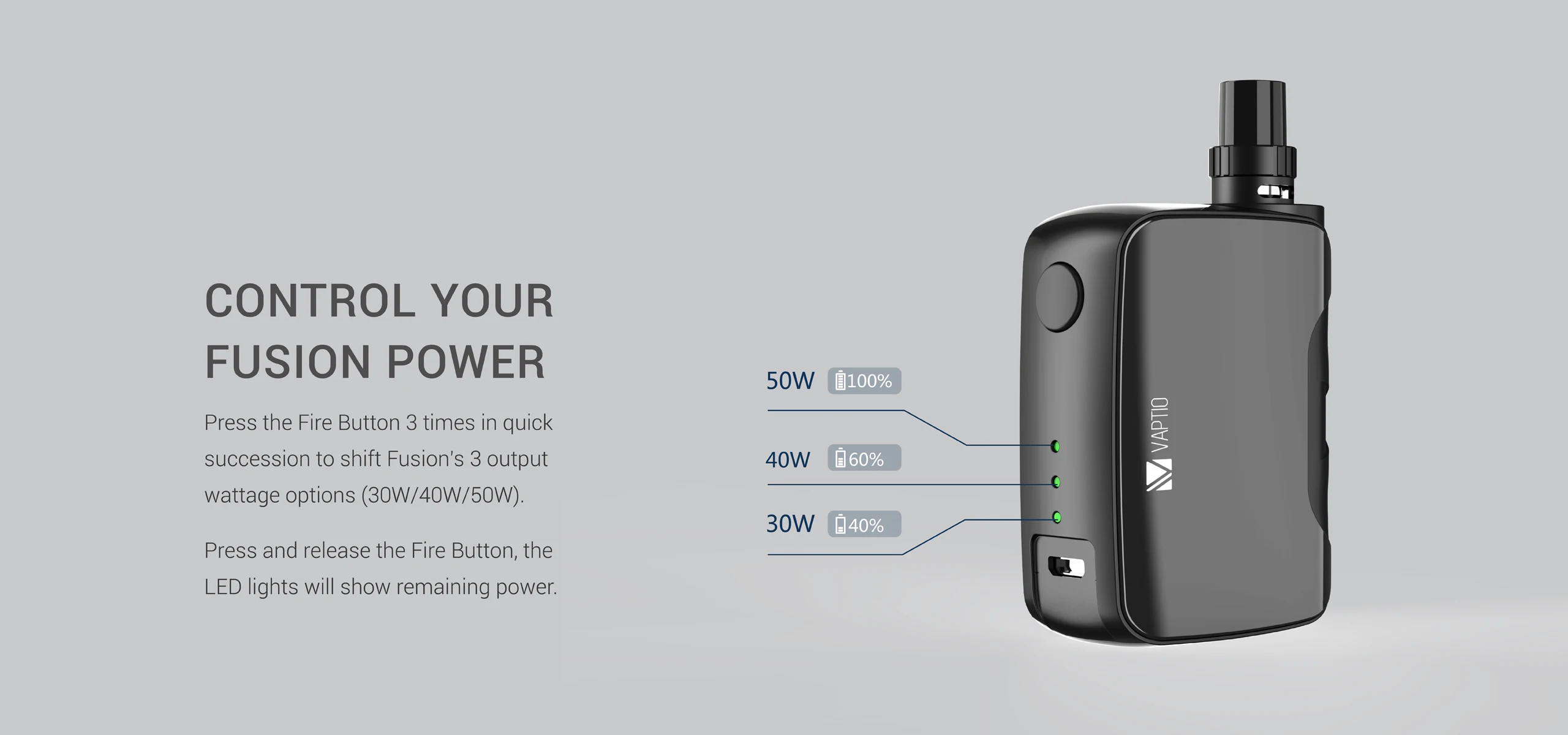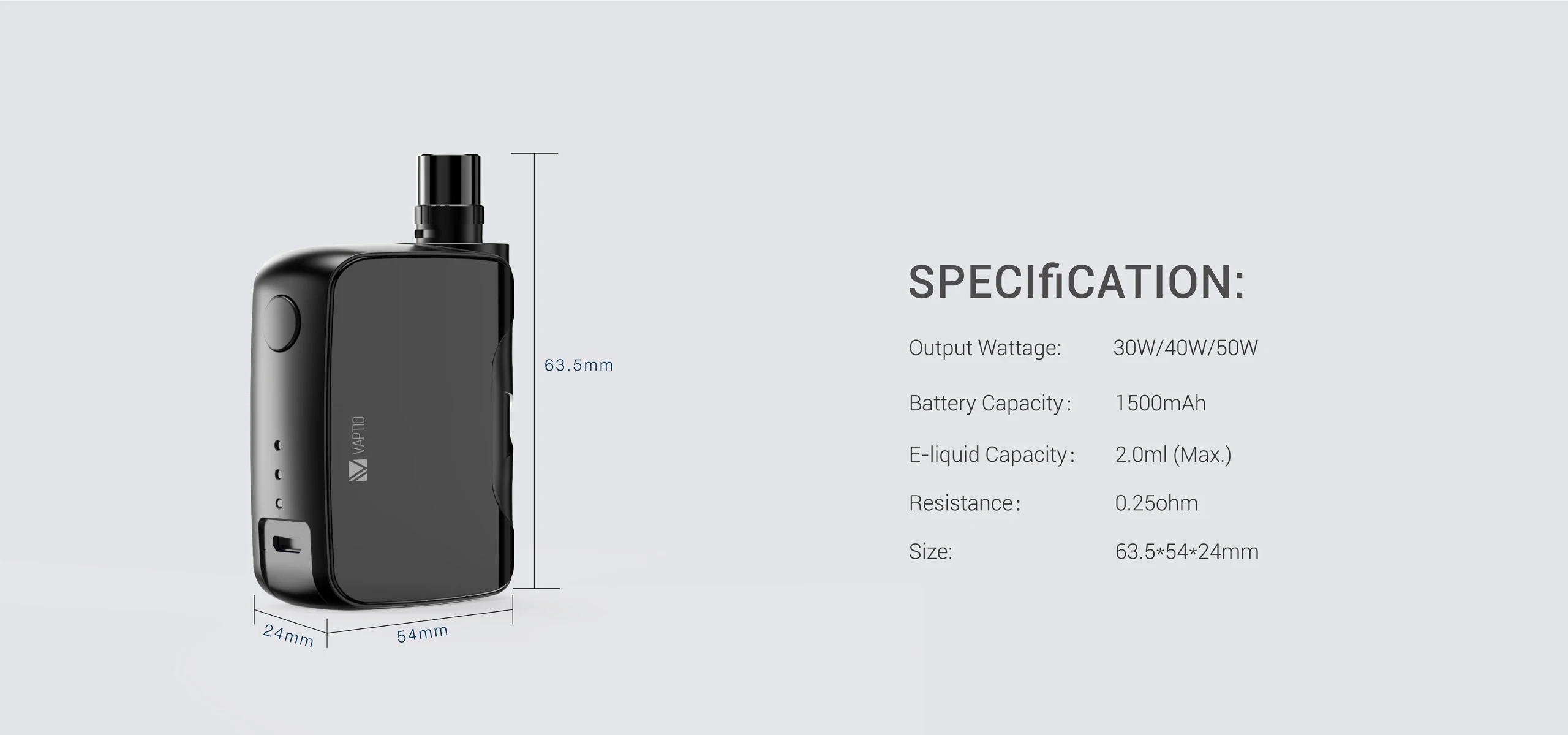 Тип: Комплект «Все в одном» Встроенный или внешний Аккумулятор: встроенный диапазон сопротивления 1500 мАч: ≥ 0,25 Ом Размер: 63,5x54x24 мм Емкость бака: 3,8 мл Выходная мощность: 30-40-50 Вт