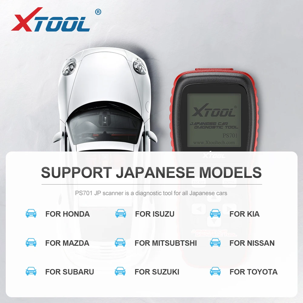 Код продавца для updation: XTOOLEN Сканер PS701 JP-это диагностический инструмент для всех японских автомобилей, он поддерживает диагностику для TOYOTA, HONDA, MITSUBISHI, SUBARU, SUZUKI и NISSAN. Xtool PS701 Поддерживает тестирование всех электронных систем управления не только для системы двигателя OBD2. Диагностический инструмент PS701 может быть сопоставим с оригинальным оборудованием в некоторой степени.