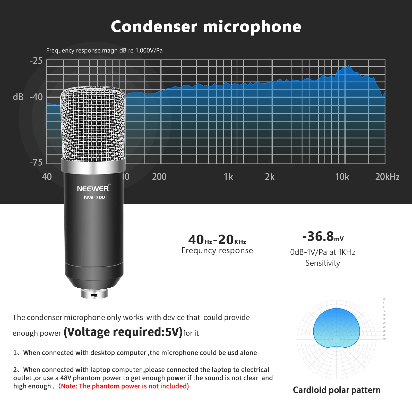 1. Конденсаторный микрофон работает только с устройством, которое может обеспечить достаточную мощность (требуемое напряжение: 5 В) для него.
