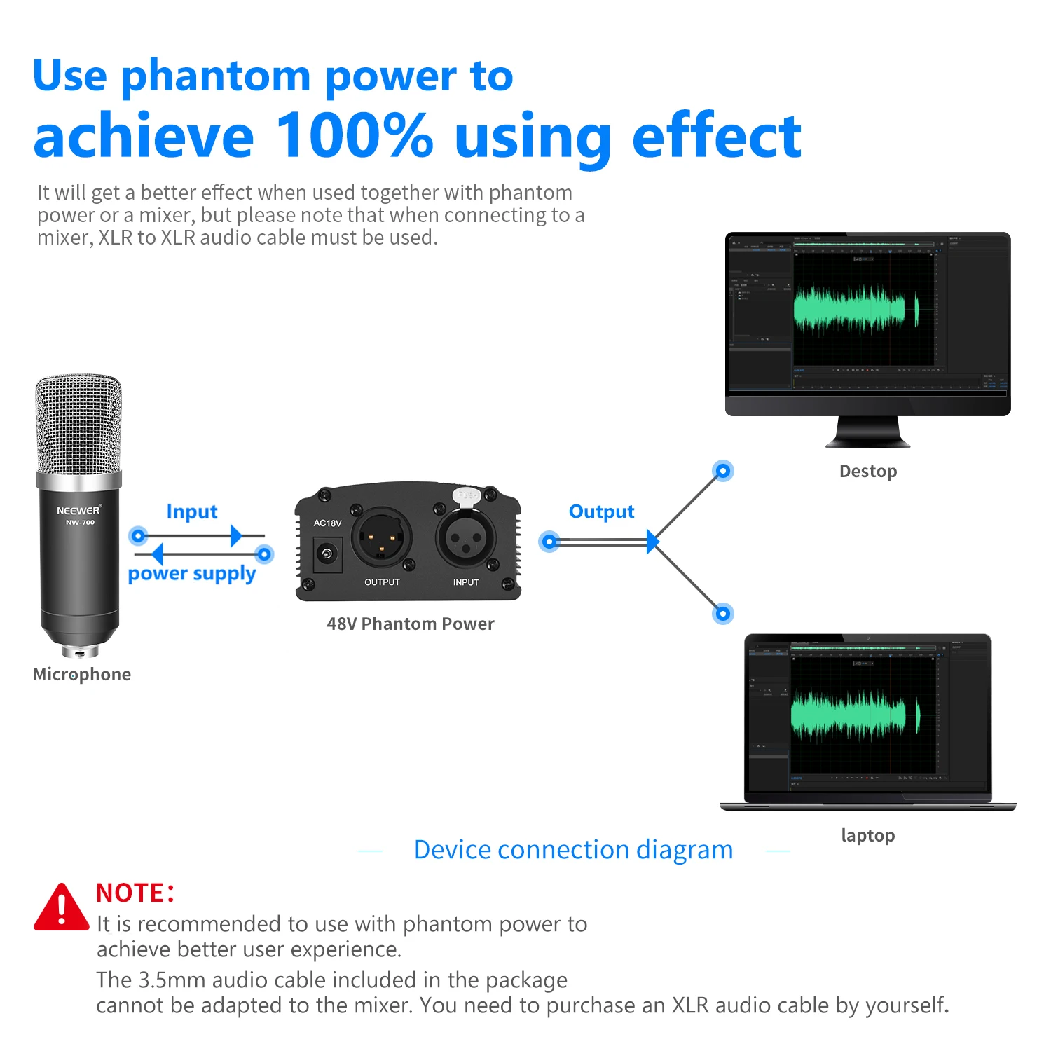 2. Если ваше устройство не может обеспечить достаточную мощность (при использовании с усилителем или миксером и т. д.), запись звука может быть низкой, И, пожалуйста, используйте дополнительный адаптер питания 48 В phantom для подключения.