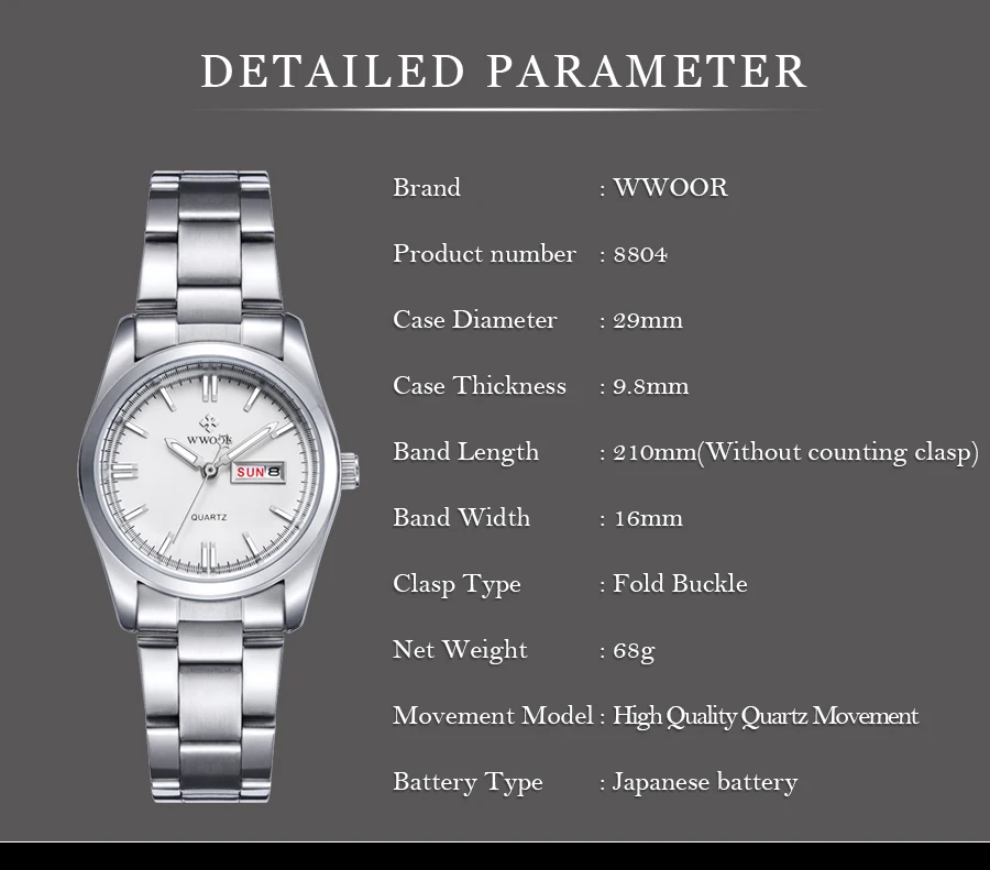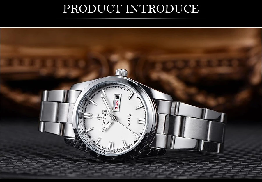 Основная особенность: Кварцевый механизм высокого качества Японские импортные аккумуляторы Стиль: модный и классический Функция отображения календаря и недели; Водонепроницаемый 3 АТМ/30 м Чехол из цинкового сплава; Ремешок из нержавеющей стали; Классические Женские Подарочные часы; Посылка включает в себя: -1 x WWOR/женские часы -1 x чистая ткань -1 инструмент регулировки ремешка -1 подарочная коробка WWOOR