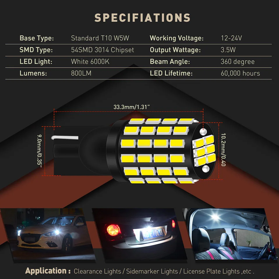 Особенности: Canbus, без ошибок, без ошибок Тип цоколя: светодиодные лампы Canbus T10 W5W 194 168 Тип светодиодный да: 54 шт. 3014 SMD Световой поток: 350-800Lm Цвет светодиодный Белый/янтарный/красный/синий Угол свечения: 360 градусов Рабочее напряжение: 9-24 В Цветовая температура: 6500 к белый Срок Светодиодный: 60000 часов Мощность: 3,5 Вт Размер: 33,3 мм * 10,2 мм * 9,0 мм Применение: Освещение номерного знака, освещение салона, Купольные огни, освещение карты, габаритные огни, фонари заднего хода, стоп-сигналы, противотуманные фары, указатели поворота и т. д.