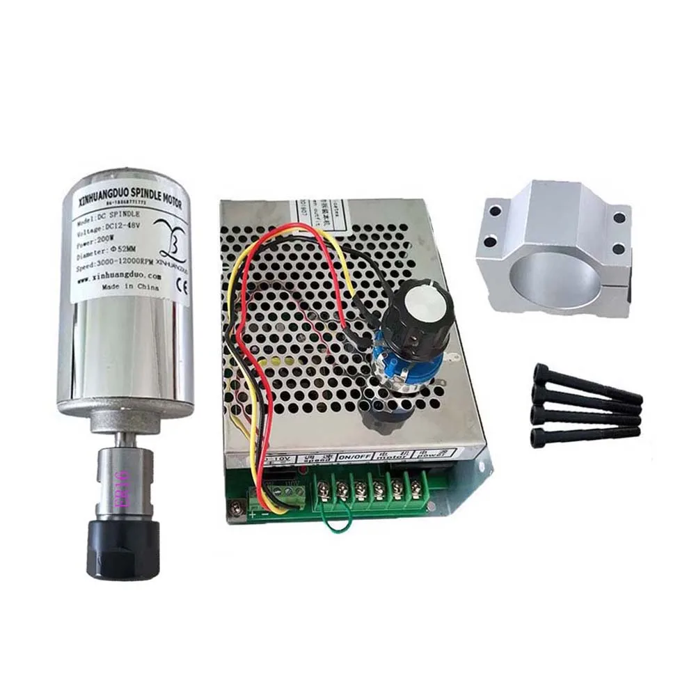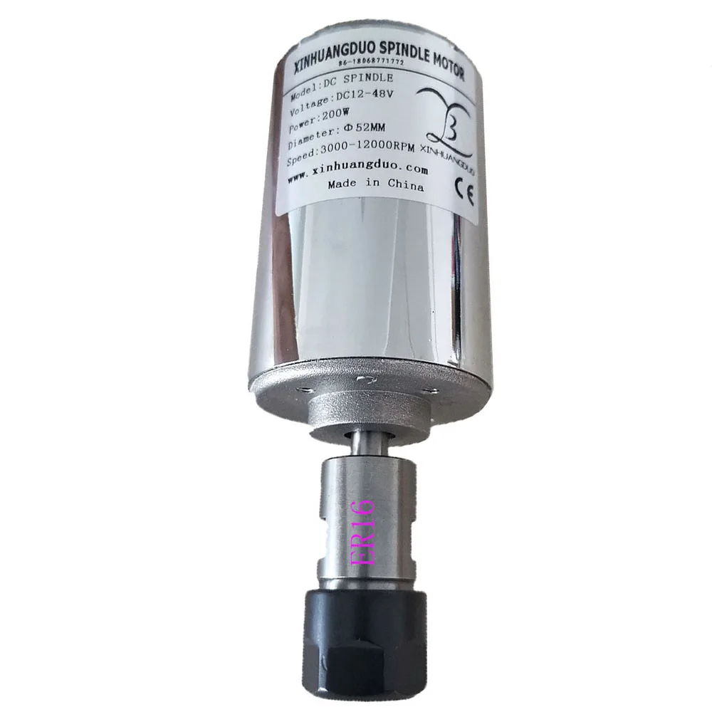 Spindle Motor Parameter:Condition:NEWDc motor: new permanent magnet brush dc motorWorking voltage: 12 to 48 VDCSpeed: 3000-12000 r/min (12 v - 3000 turn, 24 v - 3000, 36 v - 9000 turn, 48 v - 12000 RPM)Distance: 300 mn. MInsulation resistance: > 2 ohmsInsulation dielectric strength: 400 v52 mm diameter:A single motor net weight: 620 gIf the motor needs to work long hours, just need to add a cooling fan, forced air cooling, hot, or too long motorRepeat accuracy: 0.01-0.02mmSpindle Arbor ER16 Arbor Clip (1mm-10mm) Default Hair 8 MM Chuck