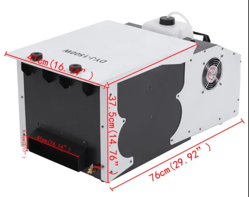 Эта машина для тумана мощностью 1500 Вт предназначена для тумана. Машина работает так же, как и эффект «сухого льда», превращая Свадебные и дискотечные танцевальные полы в чудесные места и затемняя свой пол места в установленном облаке. Дымовой туман может распределяться по краям сцены, как медленно падающий водопад. Он имеет DMX контроль, поэтому он может работать одновременно с другими системами и может быть соединен с более чем одной машиной. Будучи экономичным и практичным, он широко используется в кинотеатрах и телевизионной базе, студии, баре, диско, танцевальных залах, концертах, вечеринках и других местах развлечений.