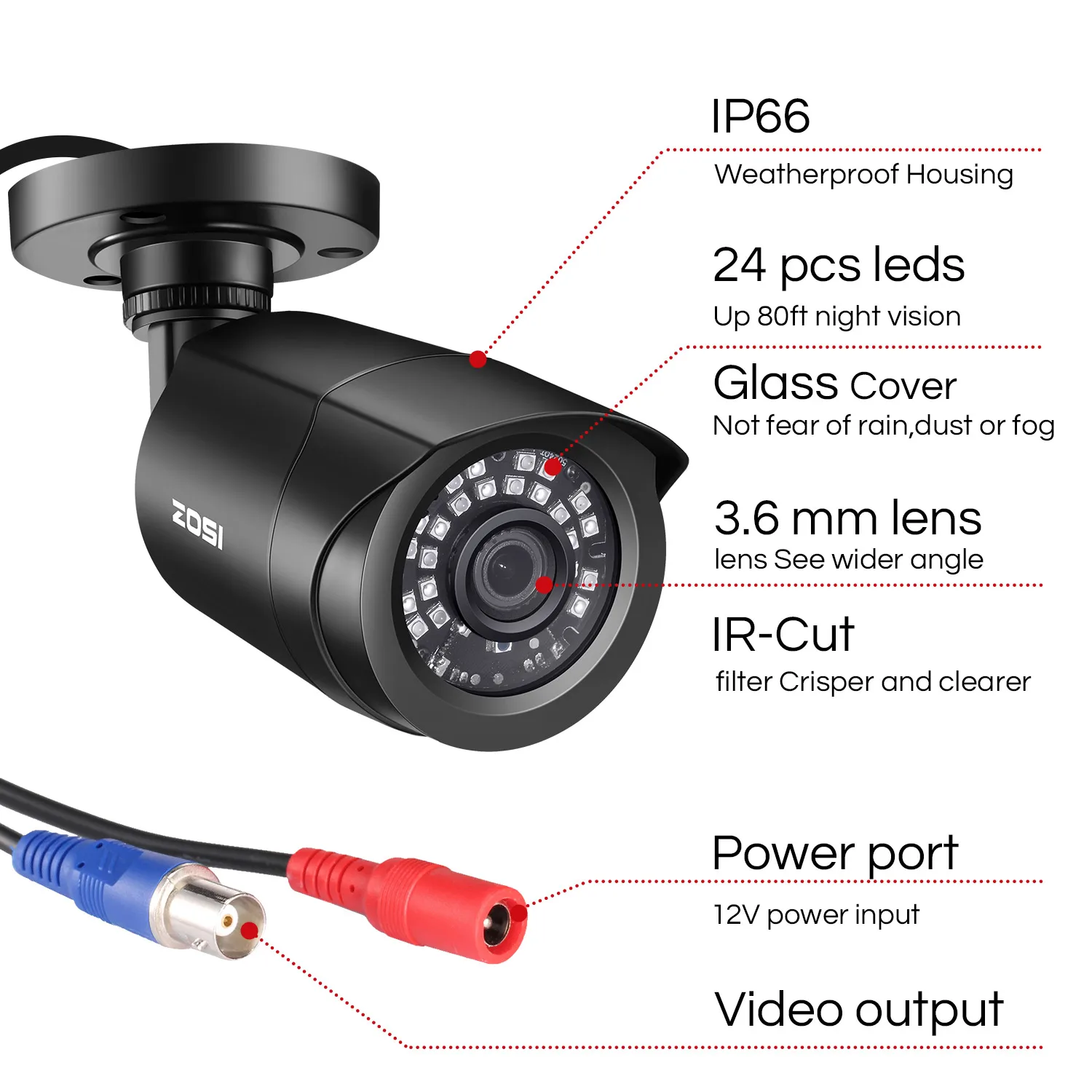 1080P Камера Параметры Датчик изображения: 1/4 "CMOS с ICR,1080P Эффективный пиксель: 1920(H)x1080(V) Объектив: мегапиксельная 3,6 мм Количество ИК-светодиодов: 24 шт., 5 мм светодиодов Ночное видение: 65 футов (20 м) Минимальное освещение: 0 лк (ИК вкл.)/0,1 лк (ИК ВЫКЛ.) Рабочая среда:-20 ~ + 50, 10% ~ 90% Водонепроницаемый уровень: IP66