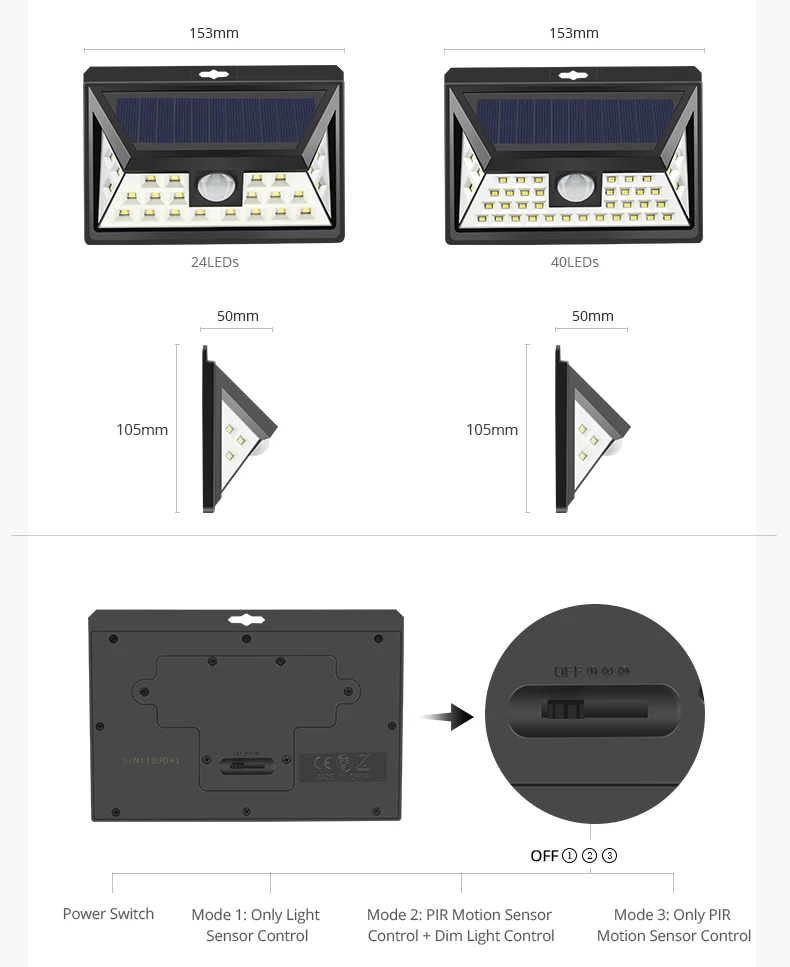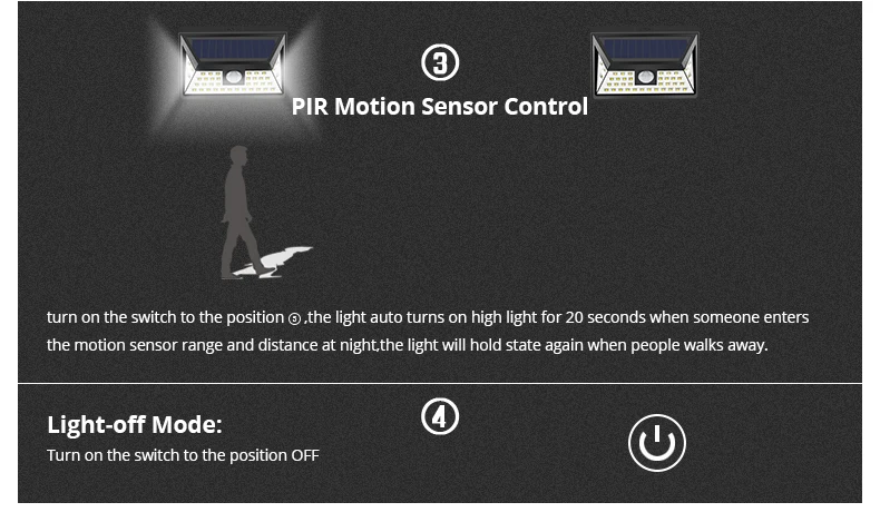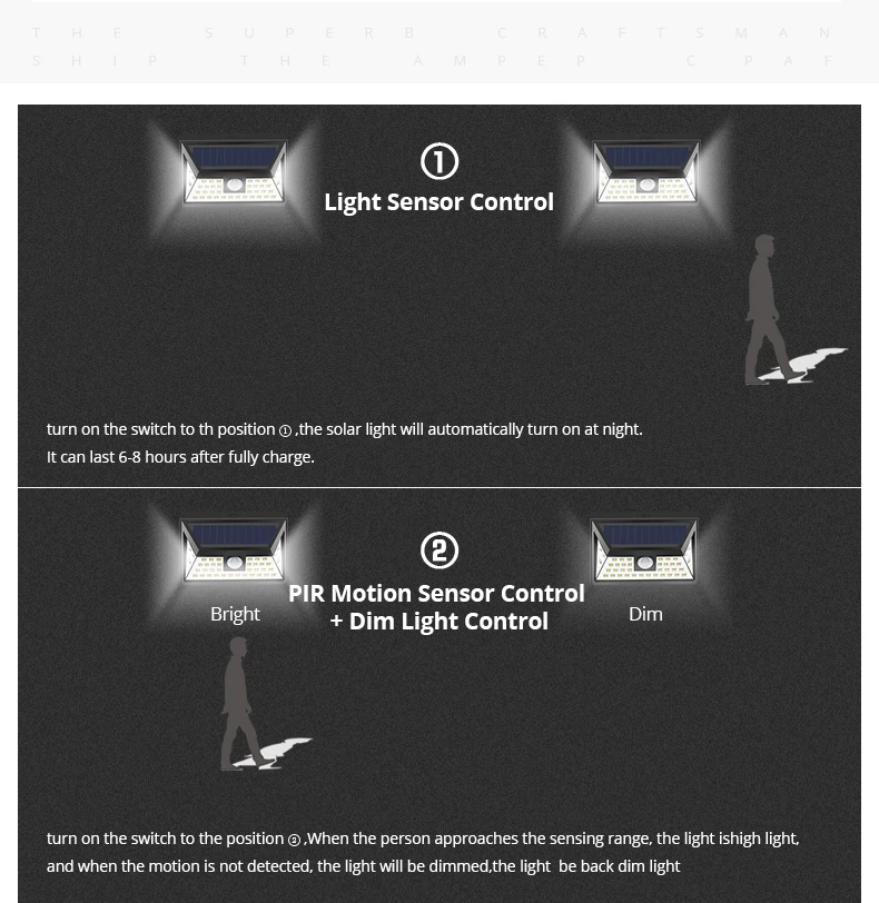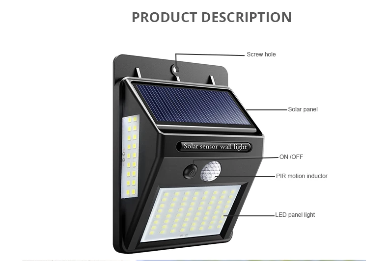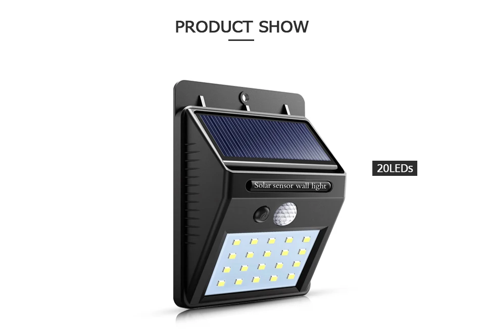 Особенности: 2 датчика: светильник и чувствительный датчик движения, экономия энергии На солнечной энергии, легко для установки Автоматическое определение дня или ночи Переключатель внутри для экономии энергии во время отгрузки Отличное полезное освещение для вашего сада, двора, прохода, крыльца, патио, подъездной дороги и т. д. Бесплатная зарядка, светильник от солнца и светильник в темноте, когда люди около 10 футов закрываются Зеленая мощность, зеленое освещение УФ-защита корпуса ABS, никогда не выцветает Технические характеристики: Наименование товара: светодиодный светильник на солнечной батарее Излучаемый Цвет: белый (6000K-6500K) Светодиодный Кол-во: 20 светодиодный s/35 светодиодный s/24 светодиодный s/40 светодиодный s Мощность от Li-ion батарея Светодиодный Тип: 2835 SMD Ночной Датчик:<10 люкс Переключатель: выкл/Авто Водонепроницаемый: IP65 Светодиодный срок службы: 50000 часов Время зарядки на солнечной батарее: 8 часов Функция защиты: перезарядка, разрядка, Перегрузка по току, короткое замыкание Срок службы литий-ионного аккумулятора: 500 кругов Срок службы солнечной панели: более 5 лет Управление инструкции по уходу за изделием -Разблокируйте и активируйте устройство: используйте поставляемый ключ, чтобы нажать на гнездо вкл/выкл, чтобы разблокировать аккумулятор и светильник. -Установка устройства: используйте поставляемый расширительный столб-шарнир и винты для установки светильник там, где вы хотите. -Зарядка через солнечную панель: Установите панель на южную сторону, чтобы убедиться, что солнечного света достаточно. Посылка включает в себя: 1 x датчик движения PIR на солнечной батарее светильник Винты-2 шт. Руководство пользователя (1 шт.)