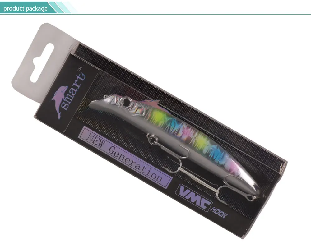 Особенности: 1. Бренд: Smart 2. Тип: жесткая приманка-гольян 3. Цвет: 9 цветов, как показано на рисунке, возможна небольшая разница в цвете. 4. Длина: 11,5 см/шт. 5. Вес: 19 г/шт. 6. Класс: плавучий 7. Глубина: 0,6 м 8. Крючок: французские тройные Крючки VMC Посылка комплект входит: Жесткая приманка в виде гольяна, 1 шт.